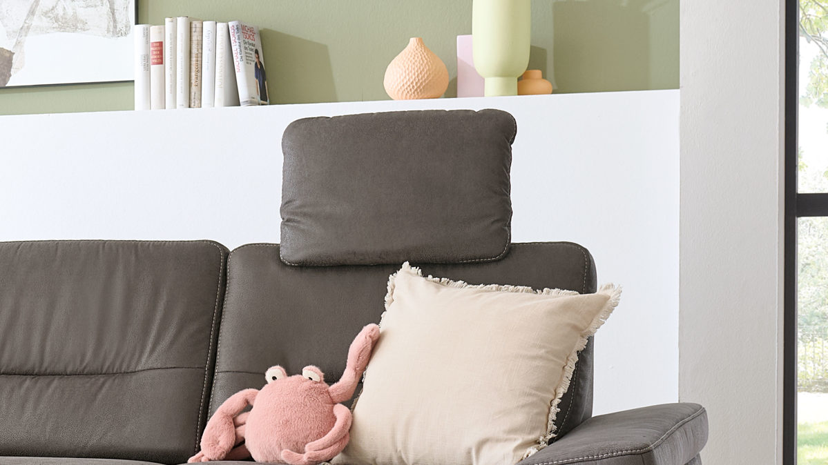 die Kopfstütze wird in die Kopfstützenvorrichtung an der Rückenlehne des Sofas eingesteckt und lässt sich dann in der Höhe und in der Neigung manuell verstellen