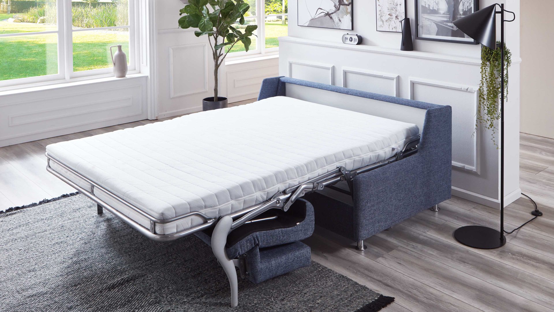 Das Schlafsofa Grande ist die perfekte Lösung für alle, die auf der Suche nach einem stilvollen und funktionalen Möbelstück sind. Mit seinem graublauen Stoffbezug und den chromfarbenen Metallzylinderfüßen ist es nicht nur ein Blickfang in jedem Raum, sondern auch äußerst bequem.
