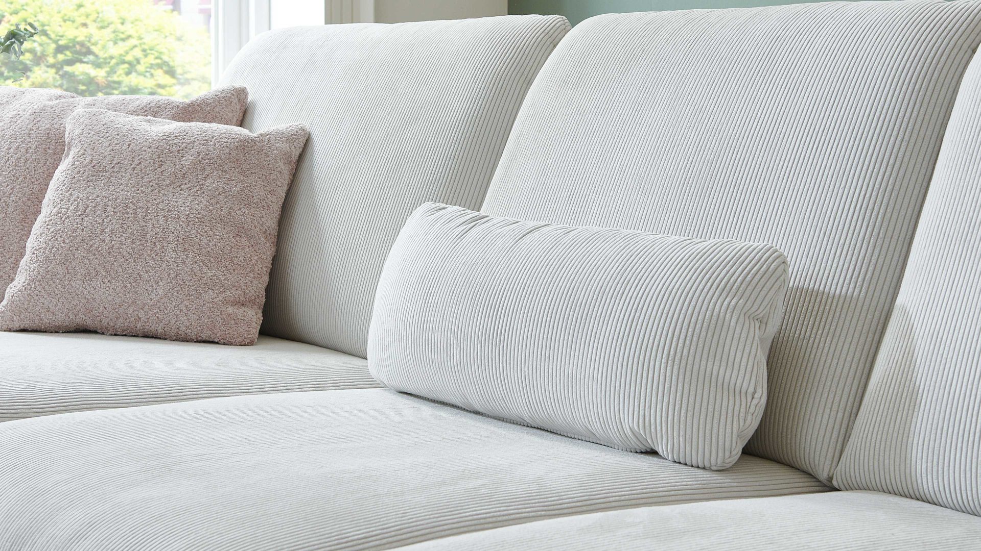 Es fungiert als bequeme Ergänzung, da es den unteren Rückenbereich stützt und dadurch ein Stück weit entlastet. Darüber hinaus hat es dekorativen Charakter. Mit dem naturweißen Feincordbezug harmoniert das Kissen perfekt mit den Sofas im gleichen Design. Seine Maße belaufen sich auf ca. 70 x 25 cm (BxL).