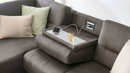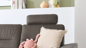 die Kopfstütze wird in die Kopfstützenvorrichtung an der Rückenlehne des Sofas eingesteckt und lässt sich dann in der Höhe und in der Neigung manuell verstellen