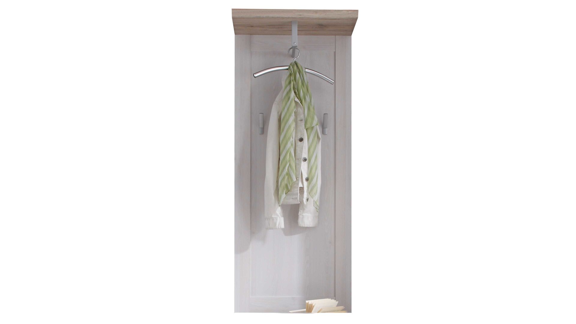 Hinter den zwei Türen der Schuhkommode befindet sich jeweils ein Boden. Überdies verfügt die ca. 96 x 91 x 38 cm (BxHxT) große Kommode über zwei Schubladen für zusätzlichen Stauraum. Die Maße des Wandspiegels belaufen sich auf ca. 96 x 92 x 4 cm (BxHxT). Zur Wandgarderobe gehören zwei Haken und ein Boden mit Kleiderstange. Sie misst ca. 59 x 143 x 30 cm (BxHxT). Die praktische Schuhbank ist mit einer Klapptür ausgestattet, hinter der sich eine Mittelwand und zwei Böden verbergen. Ihre Maße betragen ca. 76 x 50 x 38 cm (BxHxT). Gegen Mehrpreis wird Ihnen die Bank mit einem komfortablen Sitzkissen geliefert. Im Inneren des zweitürigen Garderobenschranks des Dielen-Sets erwarten Sie vier Einlegeböden und eine ausziehbare Kleiderstange. Er ist ca. 76 x 201 x 39 cm (BxHxT) groß.