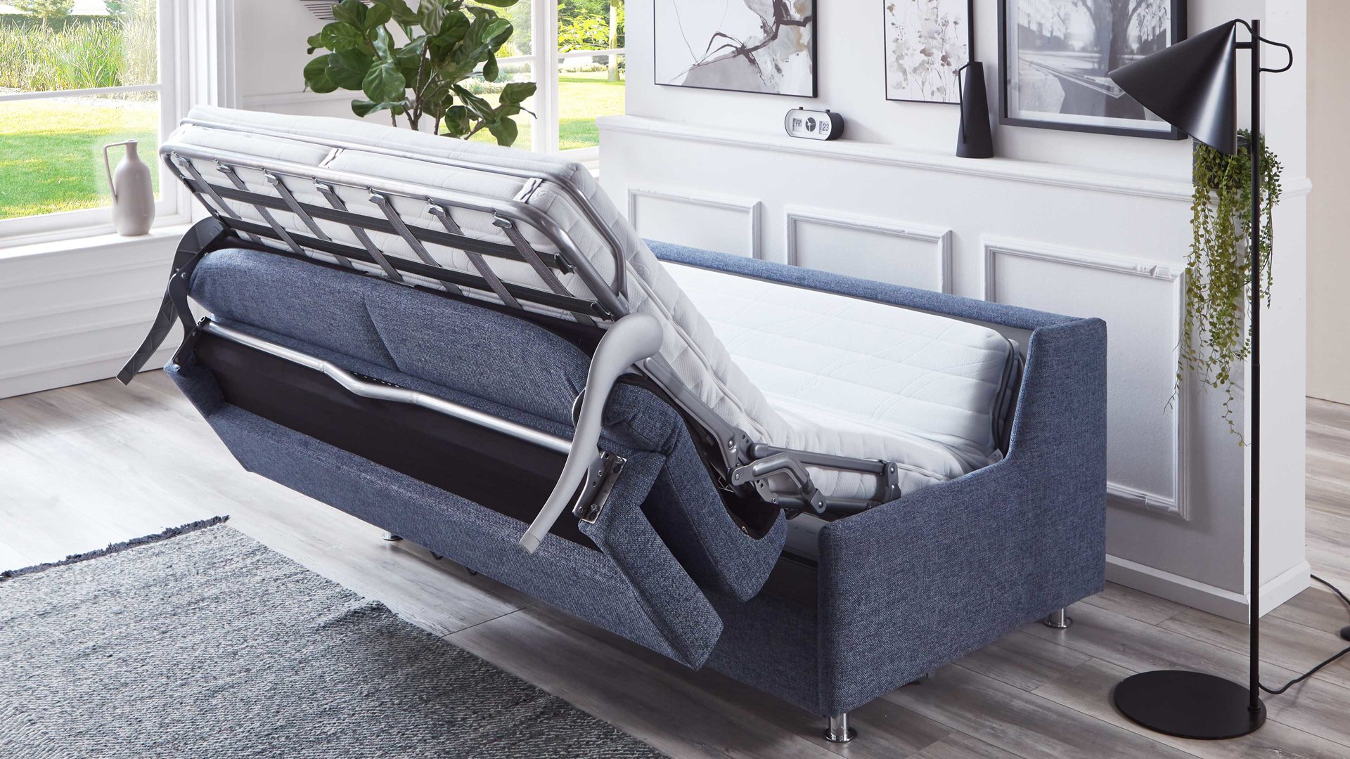 Das Schlafsofa Grande ist die perfekte Lösung für alle, die auf der Suche nach einem stilvollen und funktionalen Möbelstück sind. Mit seinem graublauen Stoffbezug und den chromfarbenen Metallzylinderfüßen ist es nicht nur ein Blickfang in jedem Raum, sondern auch äußerst bequem.