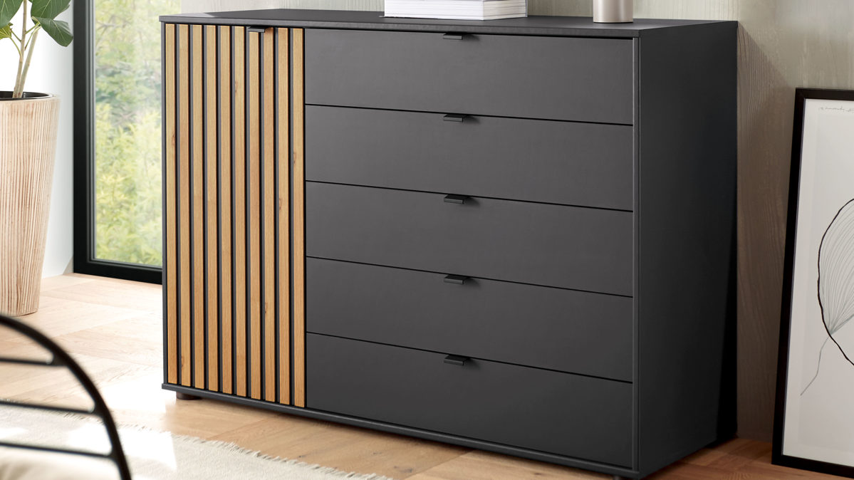Graphit & Eiche Bianco - zwei Türen, fünf Schubladen, Breite ca. 120 cm