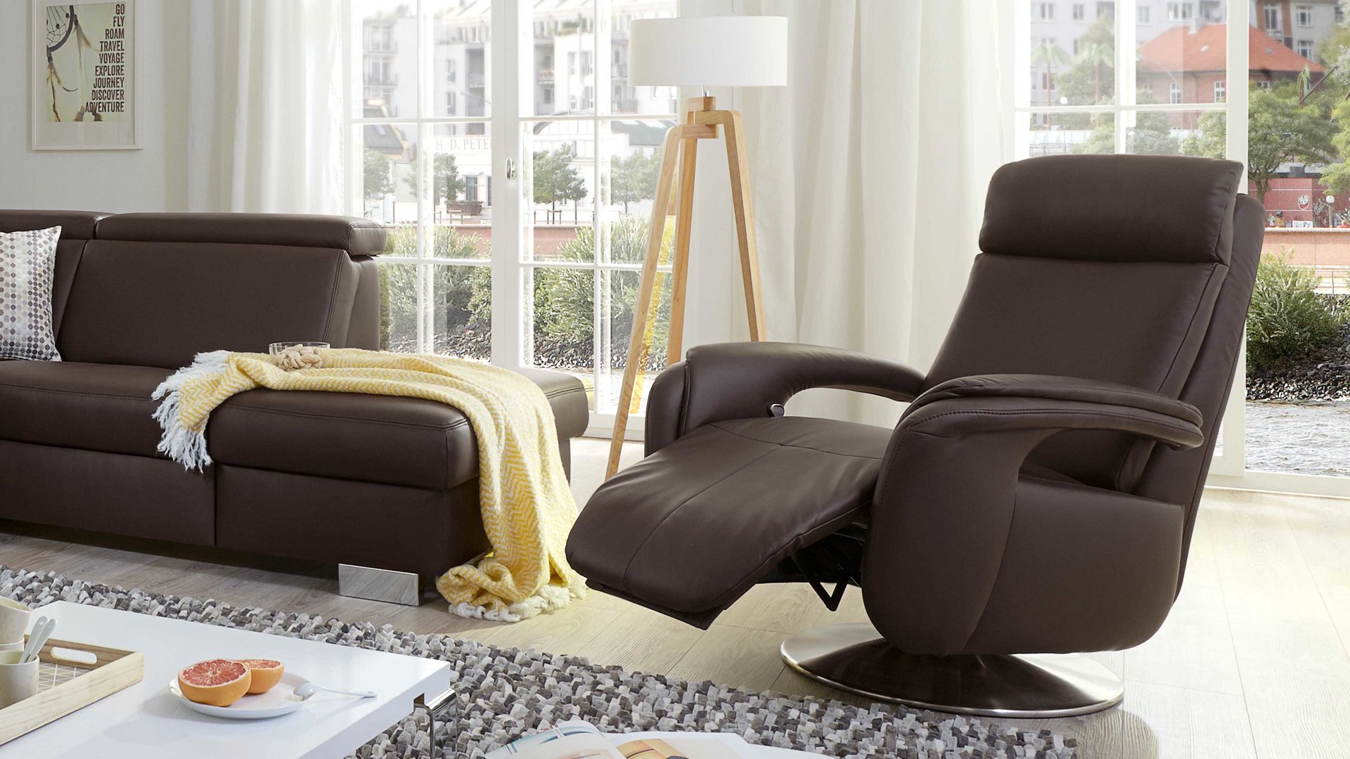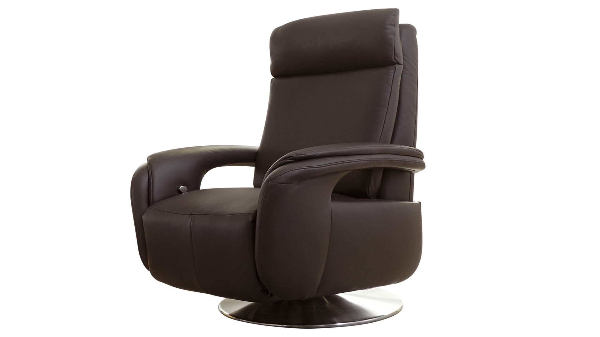 Der Modulmaster Relaxsessel MM-PN1035 kombiniert einen Edelstahl-Tellerfuß mit einem schokofarben pigmentiertem Lederbezug auf der Rückenlehne A und der Armlehnvariante 1.