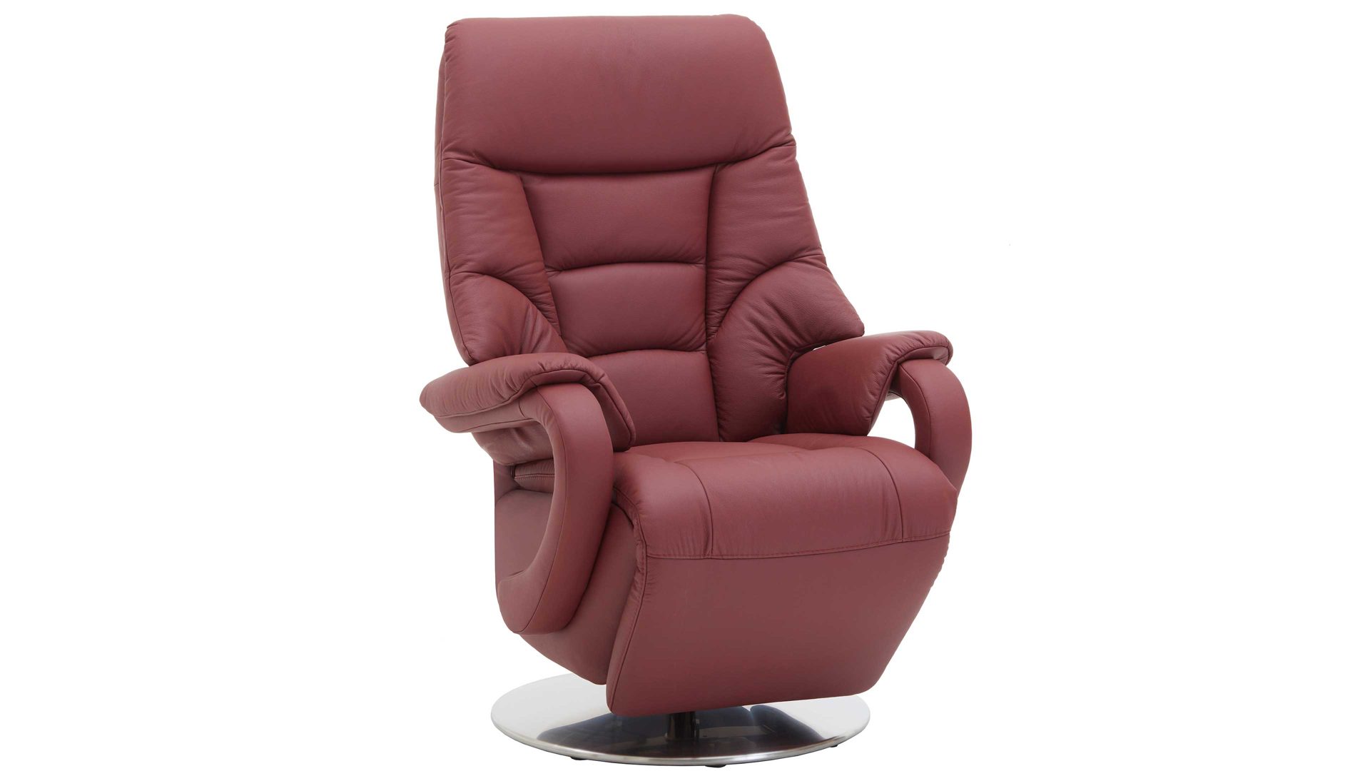 Dieser Relaxsessel kombiniert einen robusten glänzenden Edelstahl-Tellerfuß mit einem stilvollen merlotfarbenen Lederbezug. Durch die optimal aufeinander abgestimmten Materialien und Farben strahlt der Fernsehsessel moderne Eleganz aus. Für die nötige Stabilität sorgt der Stahlrohrrahmen. Er macht den TV-Sessel bis 130 kg belastbar. Die Maße des hochwertig verarbeiteten Relaxsessels belaufen sich auf ca. 80 x 116 x 80 cm (BxHxT), bei einer Sitzhöhe von ca. 49 cm und einer Sitztiefe von ca. 55 cm.