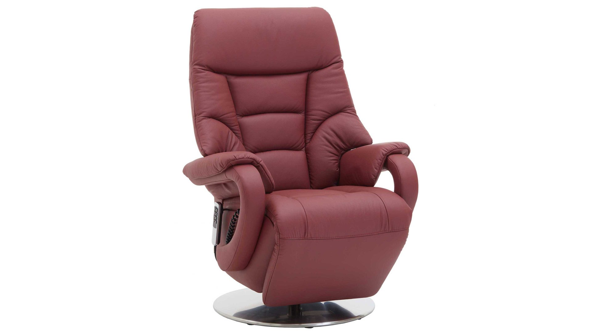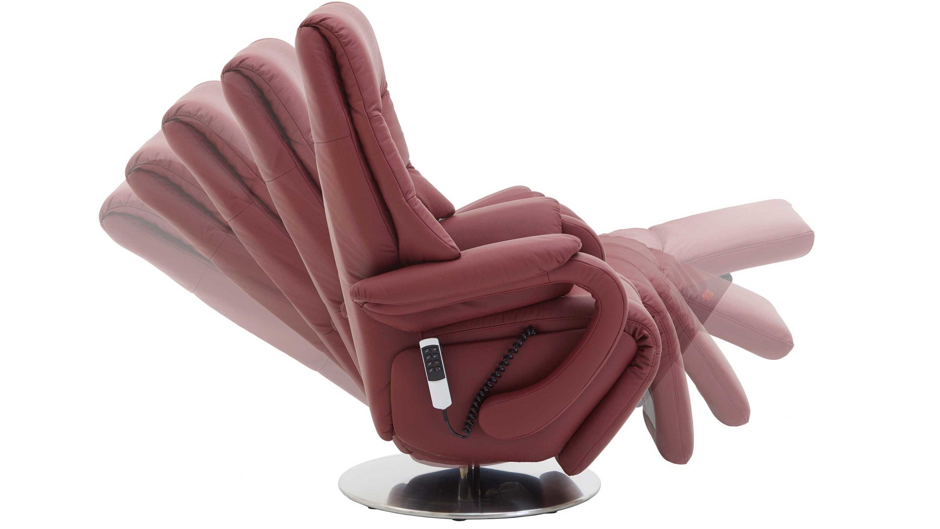 Dieser Relaxsessel kombiniert einen robusten glänzenden Edelstahl-Tellerfuß mit einem stilvollen merlotfarbenen Lederbezug. Durch die optimal aufeinander abgestimmten Materialien und Farben strahlt der Fernsehsessel moderne Eleganz aus. Für die nötige Stabilität sorgt der Stahlrohrrahmen. Er macht den TV-Sessel bis 130 kg belastbar. Die Maße des hochwertig verarbeiteten Relaxsessels belaufen sich auf ca. 80 x 116 x 80 cm (BxHxT), bei einer Sitzhöhe von ca. 49 cm und einer Sitztiefe von ca. 55 cm.