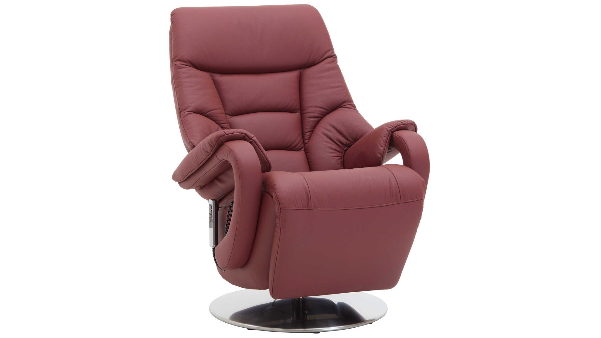 Dieser Relaxsessel kombiniert einen robusten glänzenden Edelstahl-Tellerfuß mit einem stilvollen merlotfarbenen LongLife-Lederbezug. Durch die top aufeinander abgestimmten Materialien und Farben strahlt der Fernsehsessel moderne Eleganz aus. Für die nötige Stabilität sorgt der Stahlrohrrahmen. Er macht den TV-Sessel bis 130 kg belastbar. Die Maße des hochwertig verarbeiteten Relaxsessels belaufen sich auf ca. 80 x 116 x 80 cm (BxHxT), bei einer Sitzhöhe von ca. 49 cm und einer Sitztiefe von ca. 55 cm.