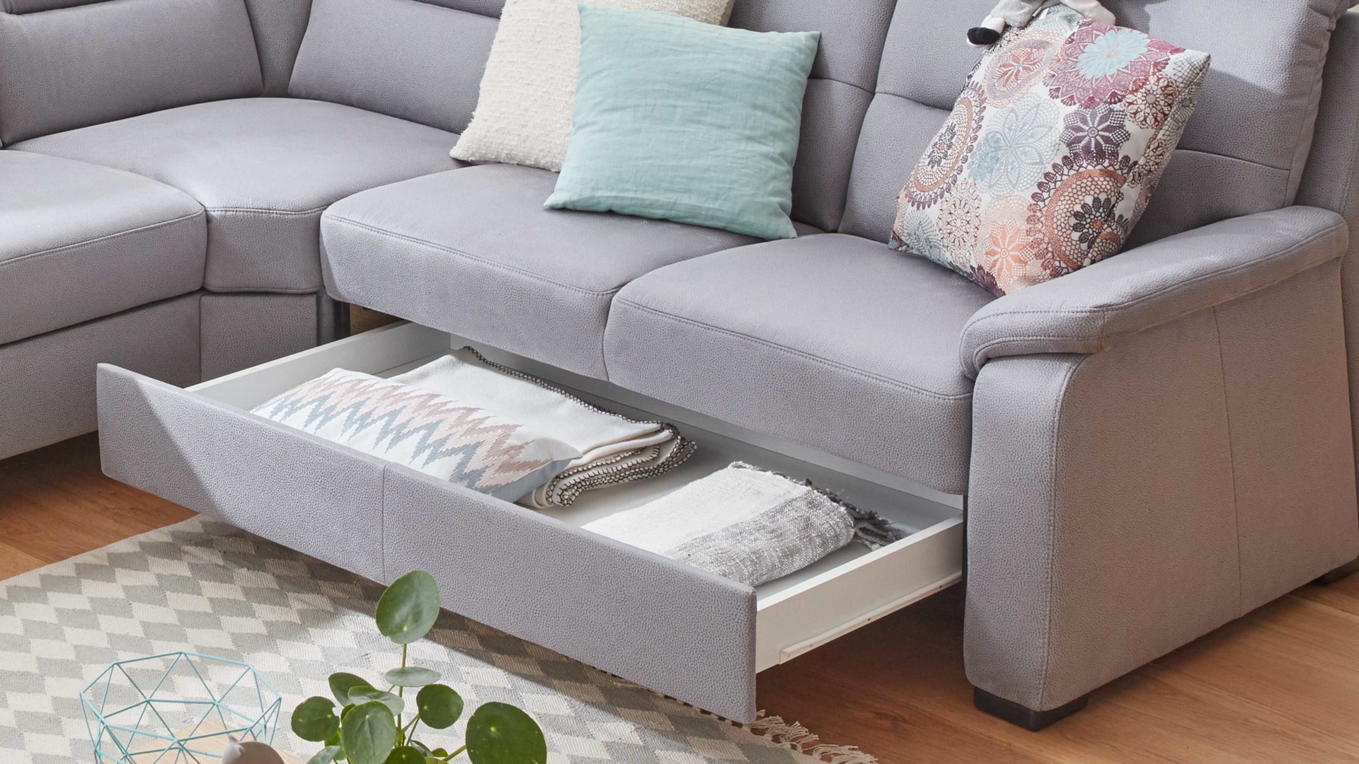 Dank der schlichten Griffmulde lässt sie sich leicht öffnen, ohne das Erscheinungsbild des Sofas zu stören. Im weiß beschichteten Innenraum können Sie etwa Decken und Zierkissen aufbewahren, wenn die Textilien gerade nicht benötigt werden.