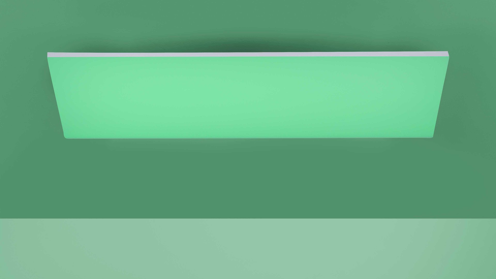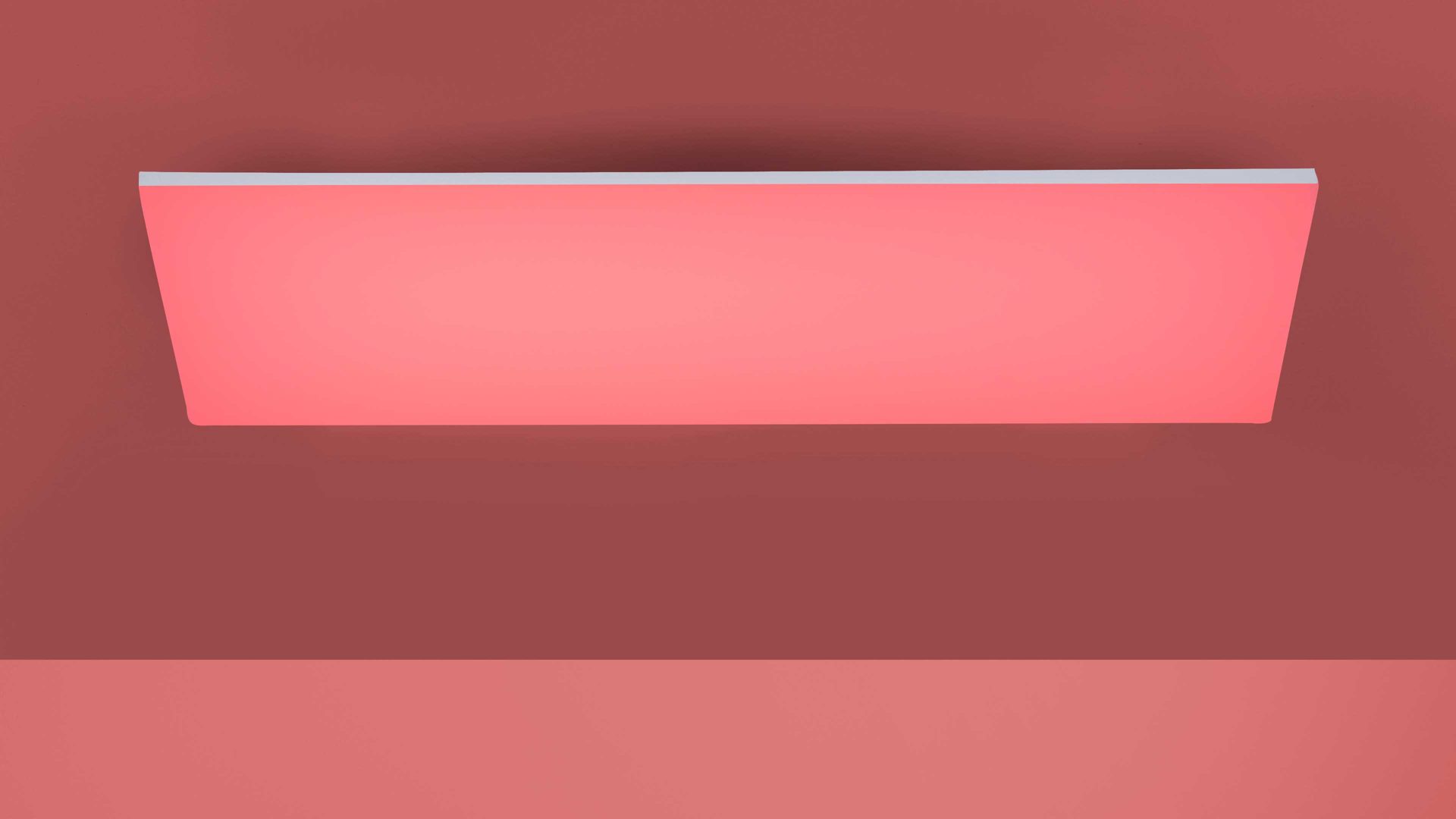 Durch die zurückhaltende Optik können Sie die weiße Deckenleuchte vielfältig in Ihrem Zuhause einsetzen. Ob im Wohnraum oder im Arbeitszimmer - die rechteckige Lichtquelle erfüllt zuverlässig Ihren Zweck. Sie wird inklusive einem festverbauten LED-Leuchtmittel aus der Energieeffiziensklasse E (Spektrum A bis G) und einer Q® Funk-Fernbedienung geliefert. Über die Fernbedienung können Sie durch den integrierten RGB+W Farbwechsel das Licht in warmweiß oder in einer Farbe aus über 16 Millionen Farbnuancen erstrahlen lassen. Ebenso können Sie die Lichtintensität dimmen und über die Memory Funktion Ihre Einstellung speichern.