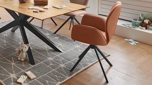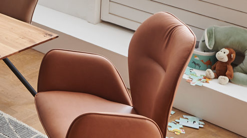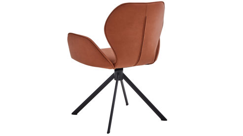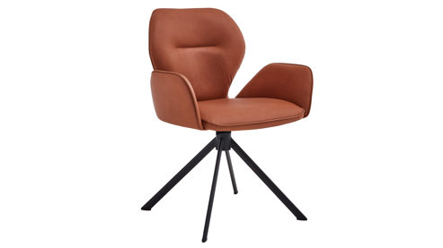 Er kombiniert ein mattschwarz lackiertes Stativgestell aus robustem Eisen mit einem cognacfarbenen Mikrofaserbezug in Lederoptik und fügt sich in verschiedene Wohnstile harmonisch ein. Zu den optischen Highlights des Esszimmerstuhls gehört neben der Formensprache und den perfekt aufeinander abgestimmten Farben der markante Quereinzug im Rücken.
