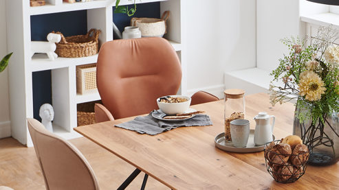 Bei Cloudy handelt es sich um ein individuell planbares Möbelprogramm bestehend aus Esszimmerstühlen und dazu passenden Esstischen. Die Stühle gehen mit einer großen Stoff- und Ledervielfalt einher. Darüber hinaus sind sie mit zwei Sitzschalen und drei Gestellen sowie mit und ohne Drehfunktion und Armlehnen erhältlich. Gegen Mehrpreis stehen auch Filzgleiter für das Metallstativ zur Wahl.