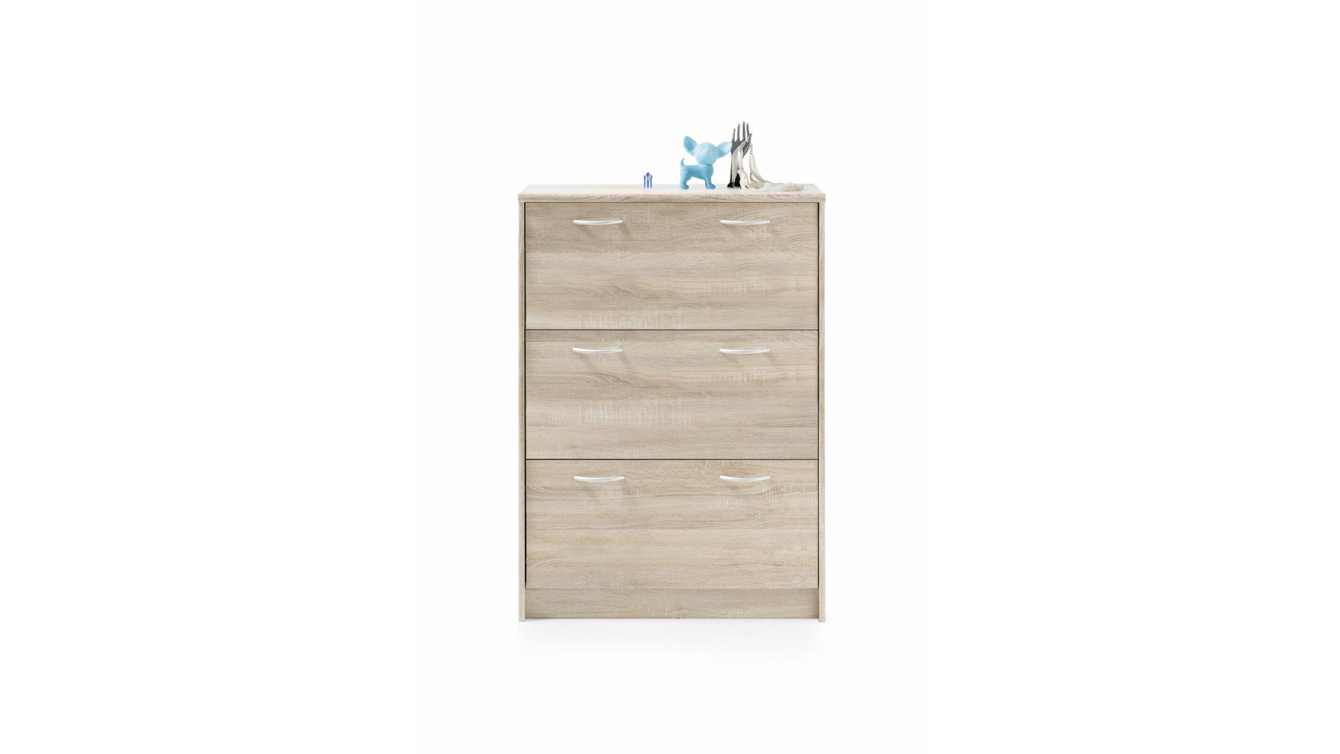 Der Schuhkipper Optimus ist enorm stilvoll designt und ausgesprochen praktisch. Mit den Sonoma eichefarbenen Kunststoffoberflächen bringt der Schuhschrank moderne Eleganz gepaart mit natürlichem Charme in den Raum, in dem Sie ihn platzieren. Akzente setzen die alufarbenen Griffe - sie heben sich einerseits ab, verbinden sich auf der anderen Seite aber auch perfekt mit dem Holzton des attraktiv gestalteten Korpus.