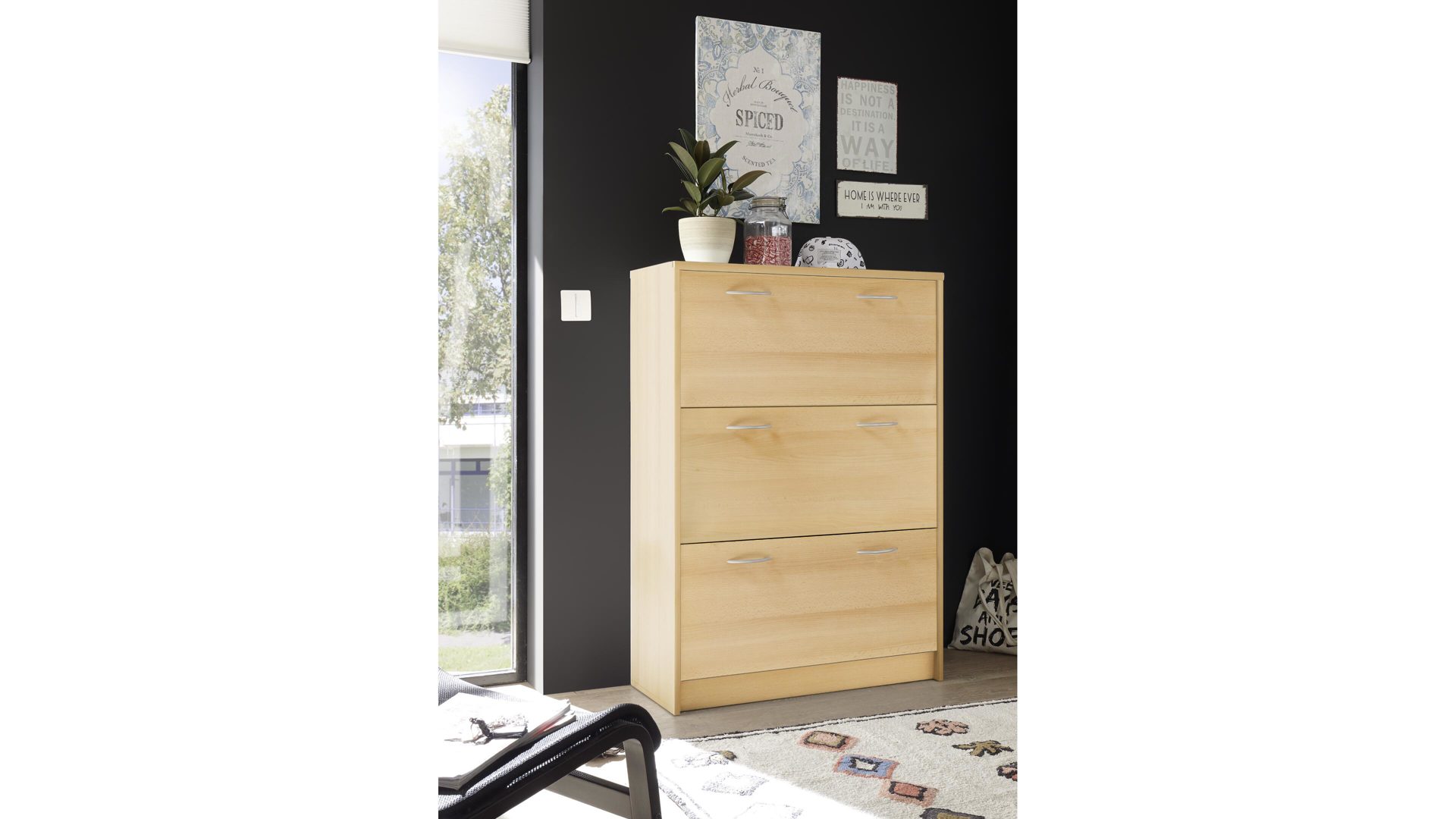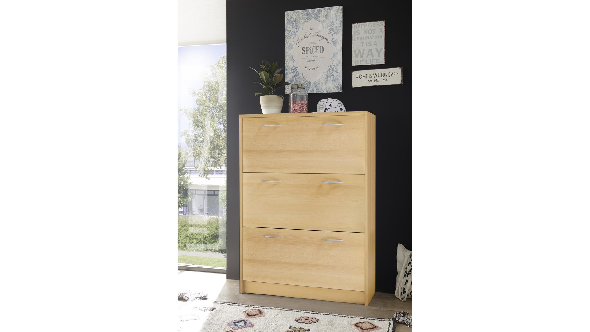 Der Schuhkipper Optimus ist enorm stilvoll designt und ausgesprochen praktisch. Mit den warmen buchefarbenen Kunststoffoberflächen bringt der Schuhschrank moderne Eleganz gepaart mit natürlichem Charme in den Raum, in dem Sie ihn platzieren. Akzente setzen die alufarbenen Griffe - sie heben sich einerseits ab, verbinden sich auf der anderen Seite aber auch perfekt mit dem Holzton des attraktiv gestalteten Korpus.