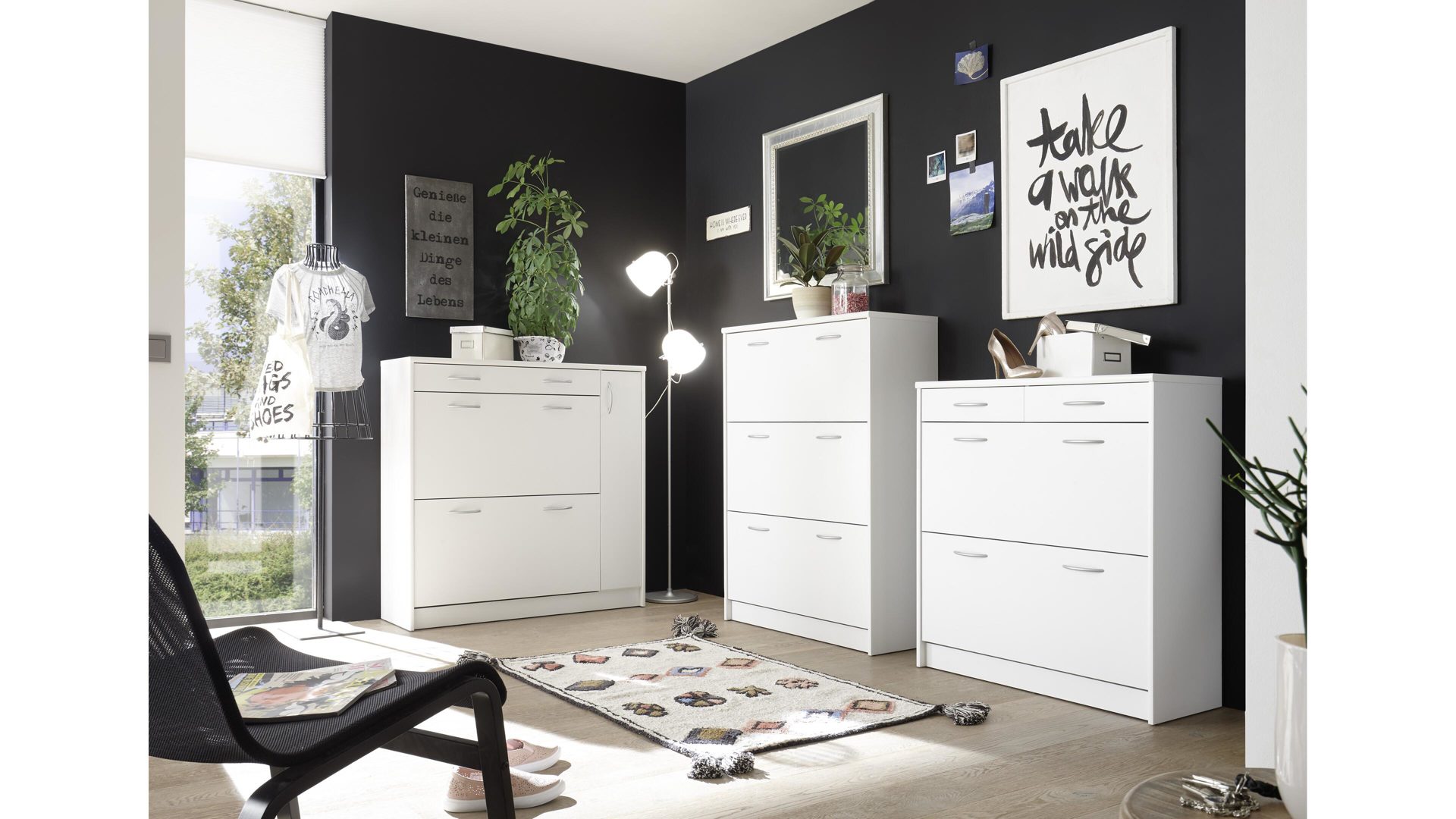 Der Schuhkipper Optimus ist enorm stilvoll designt und ausgesprochen praktisch. Mit den strahlend weißen Kunststoffoberflächen bringt der Schuhschrank moderne Eleganz in den Raum, in dem Sie ihn platzieren. Akzente setzen die alufarbenen Griffe - sie heben sich einerseits ab, verbinden sich auf der anderen Seite aber auch perfekt mit dem Weiß des attraktiv gestalteten Korpus.