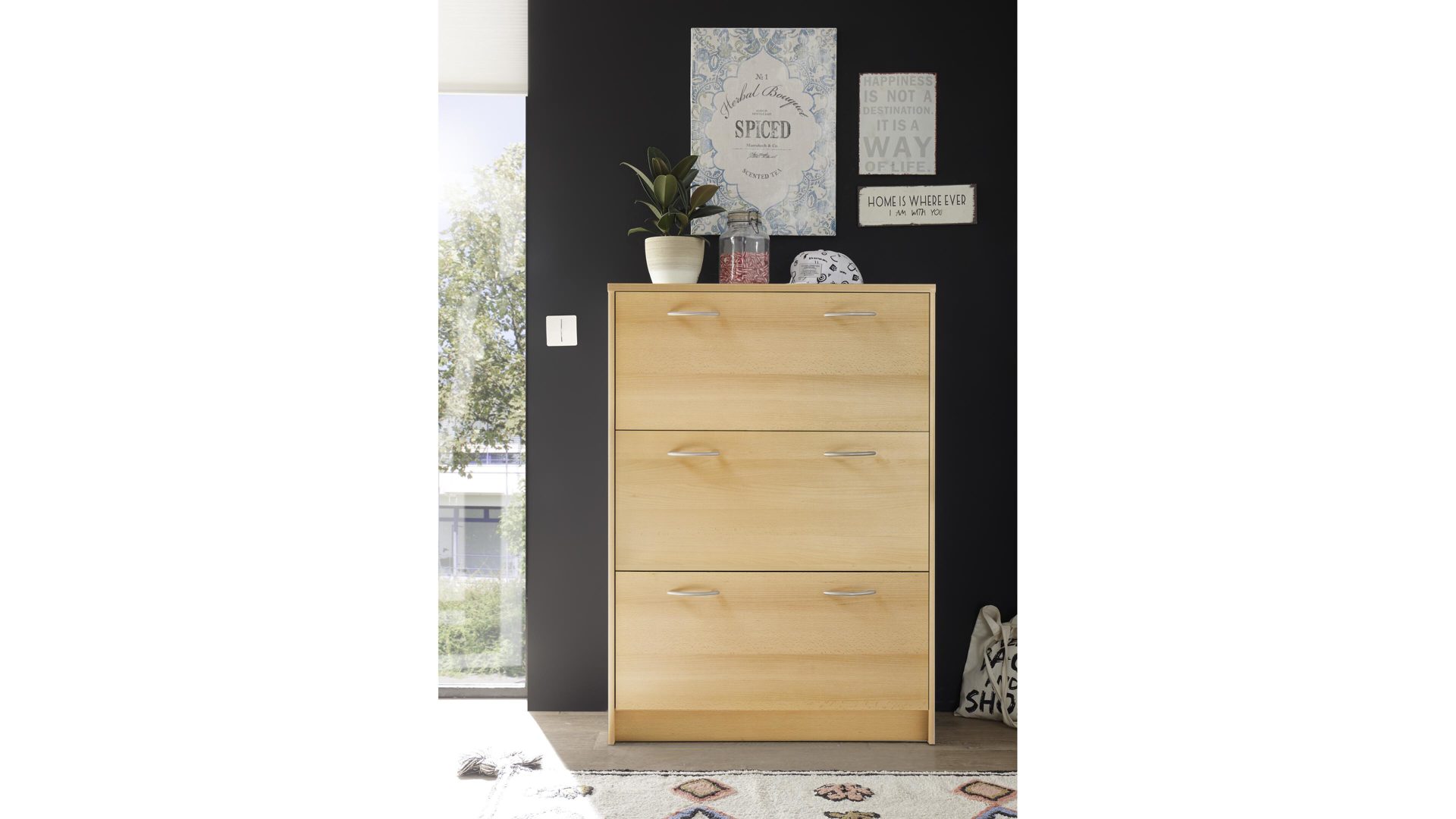 Der Schuhkipper Optimus ist enorm stilvoll designt und ausgesprochen praktisch. Mit den warmen buchefarbenen Kunststoffoberflächen bringt der Schuhschrank moderne Eleganz gepaart mit natürlichem Charme in den Raum, in dem Sie ihn platzieren. Akzente setzen die alufarbenen Griffe - sie heben sich einerseits ab, verbinden sich auf der anderen Seite aber auch perfekt mit dem Holzton des attraktiv gestalteten Korpus.