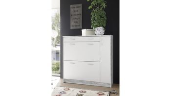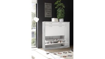 Der Schuhkipper Optimus ist enorm stilvoll designt und ausgesprochen praktisch. Mit der gelungenen Kombination aus herausragender Beton-Nachbildung und strahlend weißen Kunststoffoberflächen bringt der Schuhschrank moderne Eleganz in den Raum, in dem Sie ihn platzieren. Akzente setzen die alufarbenen Griffe - sie heben sich in gewisser Weise ab, verbinden sich auf der anderen Seite aber auch perfekt mit dem Betonton und dem Weiß des attraktiv gestalteten Korpus.