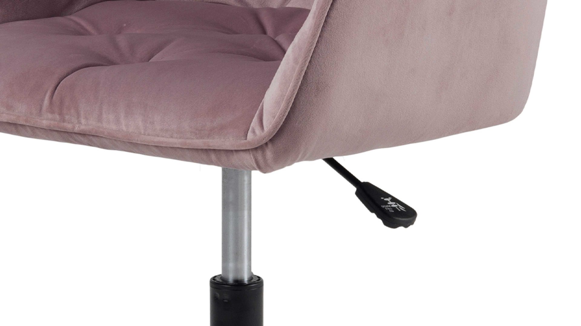 Dabei harmoniert der Drehstuhl in seiner sanften Formensprache mit zahlreichen Einrichtungsstilen: Dafür sorgt der pastellrosa Samtbezug, der die gesamte Sitzschale inklusive der bequemen Armlehnen weich umhüllt. Das pulverbeschichtete Metall-Drehkreuz fließt in mattem Schwarz stimmig in das Gesamtbild ein.