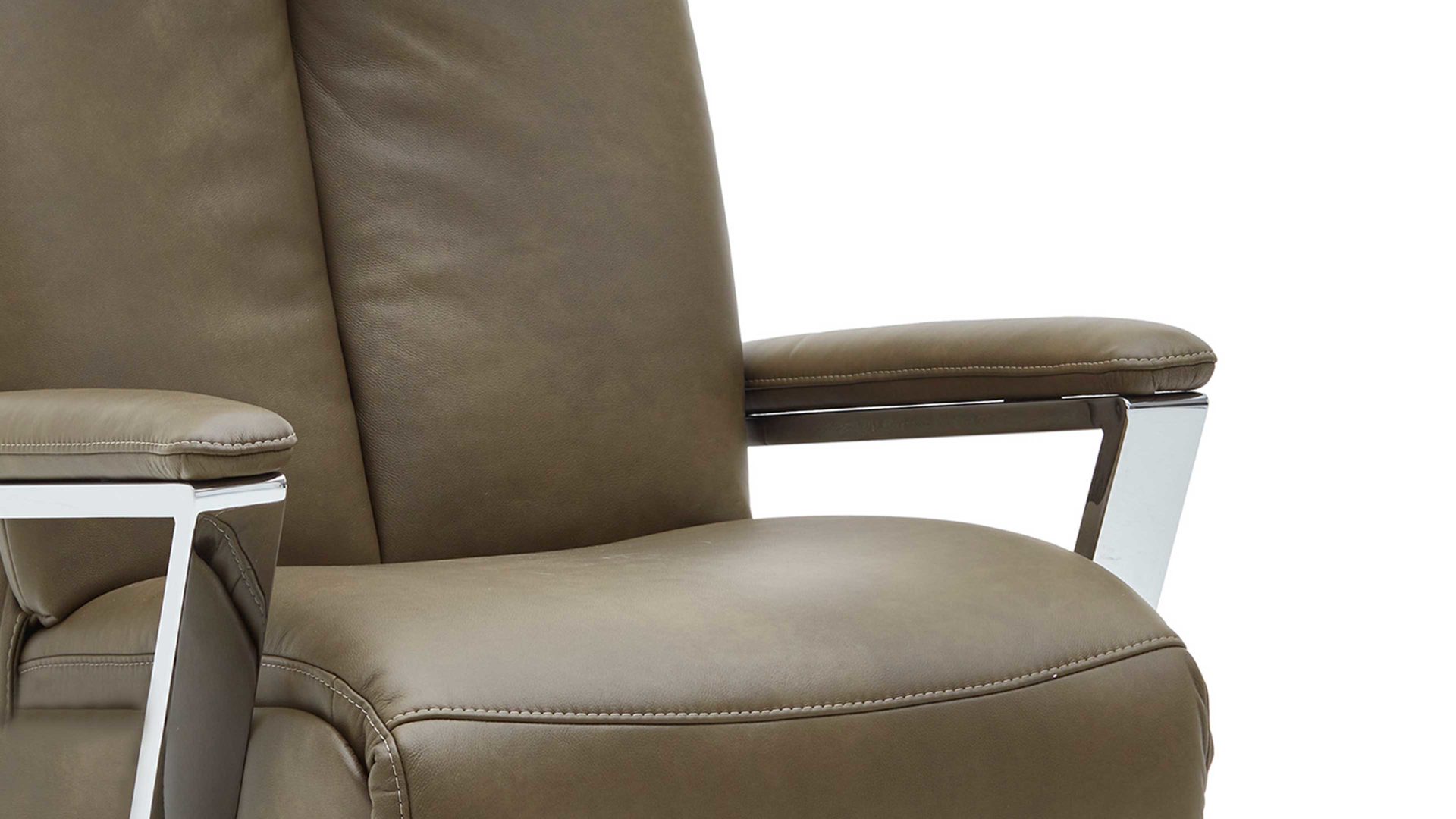 Dieser Relaxsessel kombiniert einen robusten verchromten Metall-Sternfuß mit einem stilvollen olivgrünen Lederbezug.