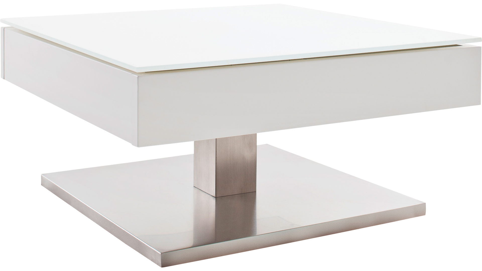 Der Couchtisch Mariko beeindruckt mit seinem außergewöhnlichen Design, das besonders extravagant erscheint und in jedem Wohnzimmer zu einem absoluten Eyecatcher wird. Als robuste Basis fungiert ein klassisch-edelstahlfarbener und gebürsteter Sockel auf einem drehbaren mattweißen Glasboden, den Sie bis maximal 20 kg belasten können. Die mattweiß lackierte Tischplatte rundet die spannende Optik des Couchtisches schlicht und harmonisch ab.