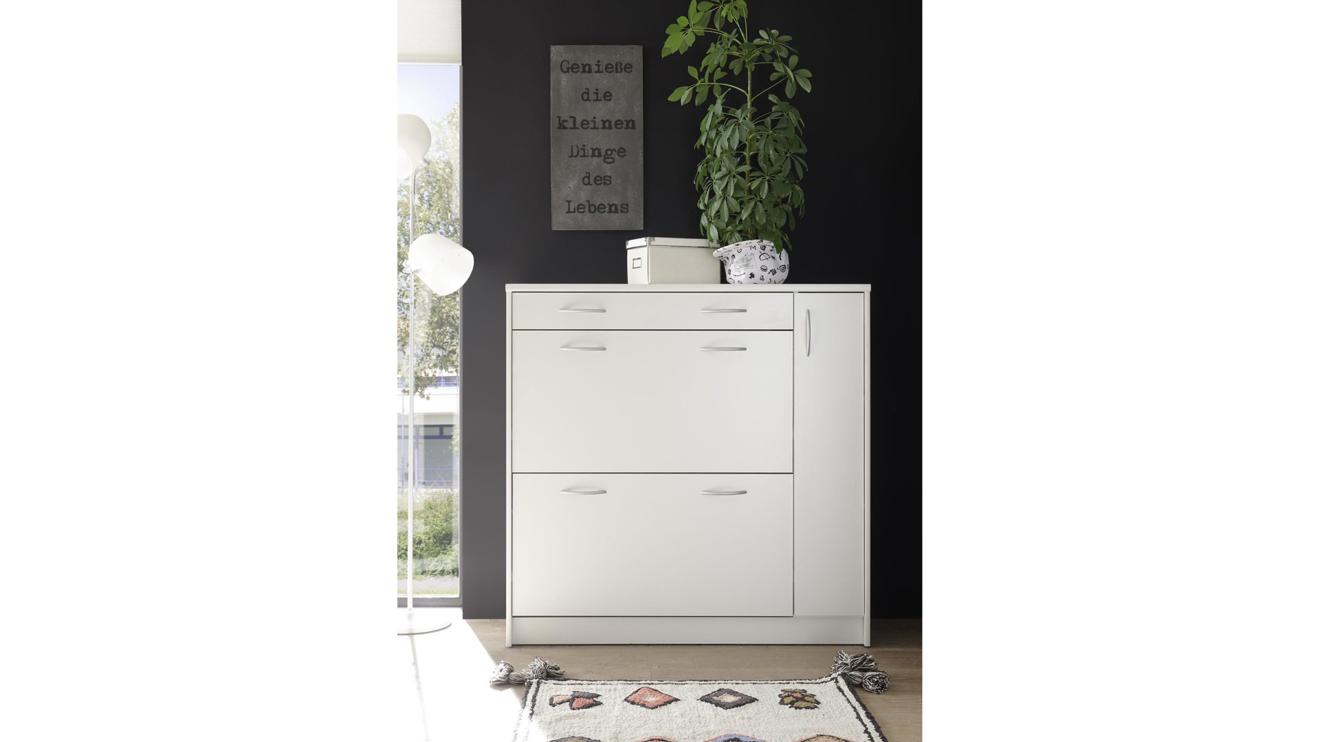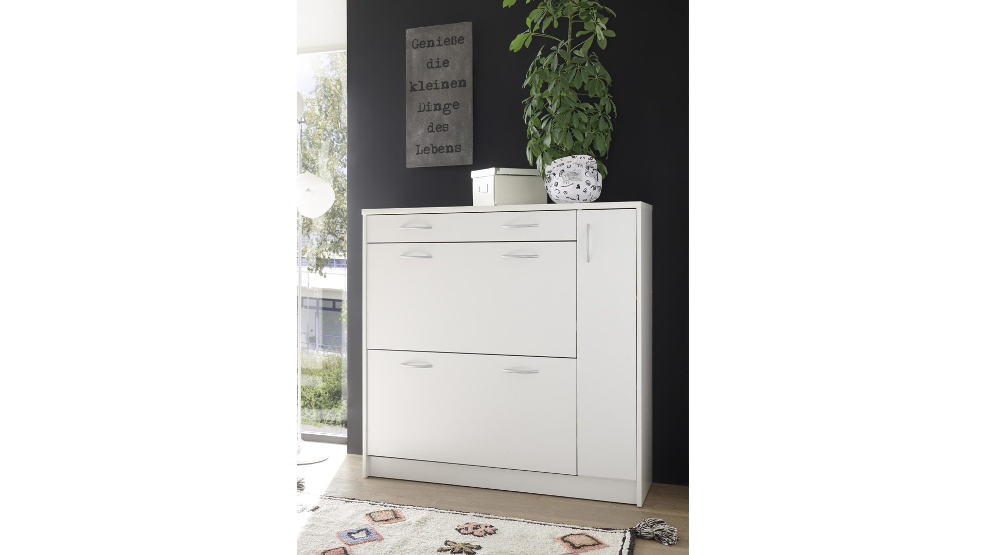Neben den optischen Vorzügen bieten die Kunststoffoberflächen einen entscheidenden funktionalen Vorteil. Sie sind besonders pflegeleicht, was Ihnen die Reinigung immens erleichtert. Hinter den zwei Klappen der erstklassig verarbeiteten Schuhkommode finden Sie Stauraum für Ihre schönsten Schuhe, die Sie gut geschützt aufbewahren möchten. Überdies beherbergt der Schuhkipper eine Schublade und einen schmalen Türbereich. Diese beiden Elemente verschaffen Ihnen die Möglichkeit, ergänzende Utensilien wie Schuhbürsten, Schuhputzmittel, Schuhlöffel und Ähnliches jederzeit griffbereit zu lagern. Gesamt misst der edle Schuhkipper ca. 108 x 108 x 36 cm (BxHxT).