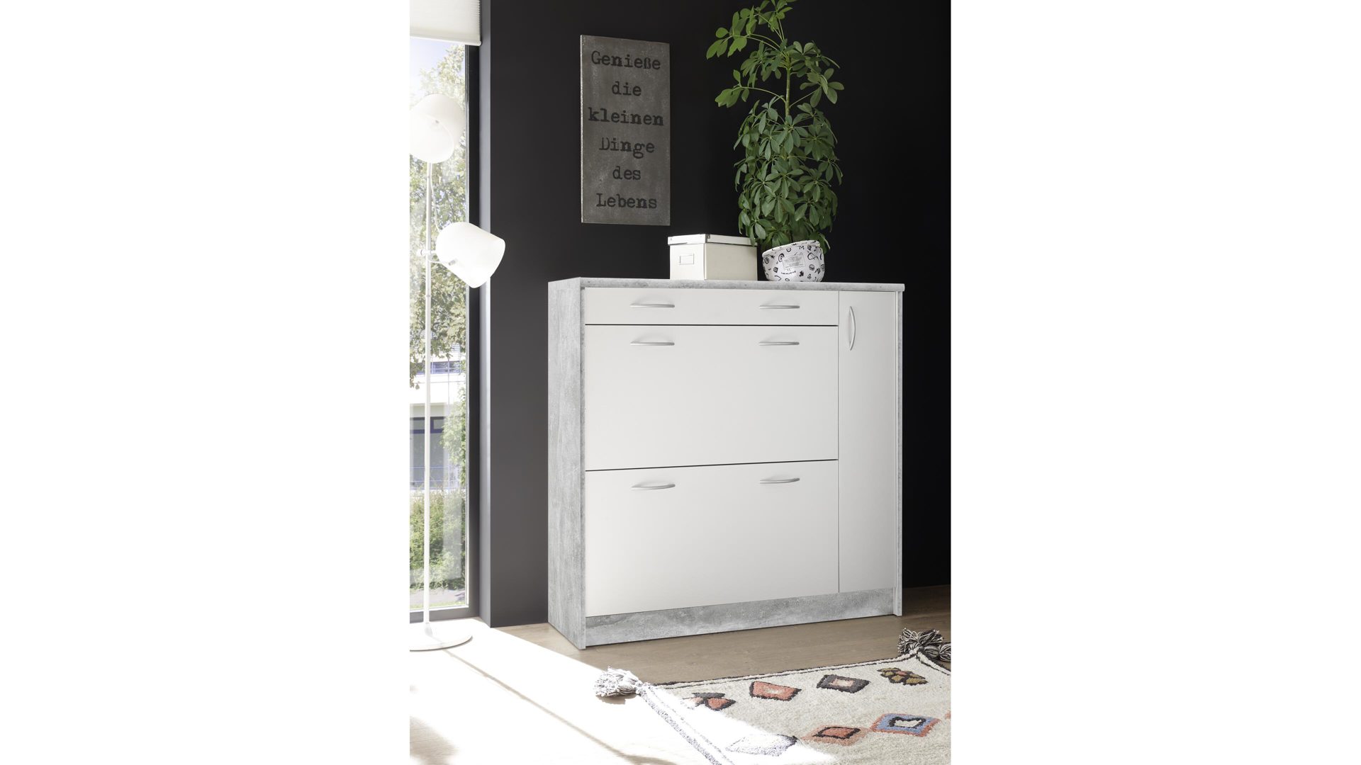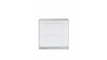 Der Schuhkipper Optimus ist enorm stilvoll designt und ausgesprochen praktisch. Mit der gelungenen Kombination aus herausragender Beton-Nachbildung und strahlend weißen Kunststoffoberflächen bringt der Schuhschrank moderne Eleganz in den Raum, in dem Sie ihn platzieren. Akzente setzen die alufarbenen Griffe - sie heben sich in gewisser Weise ab, verbinden sich auf der anderen Seite aber auch perfekt mit dem Betonton und dem Weiß des attraktiv gestalteten Korpus.