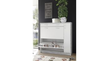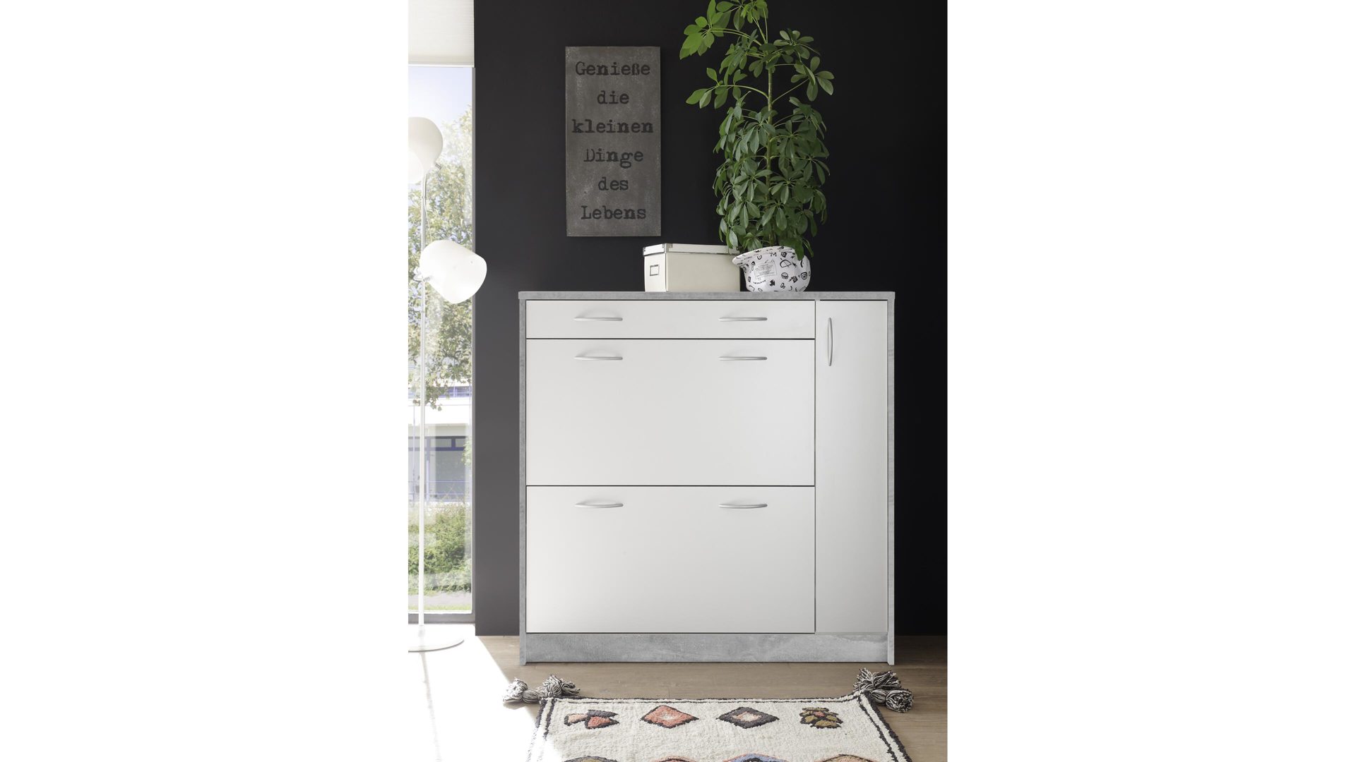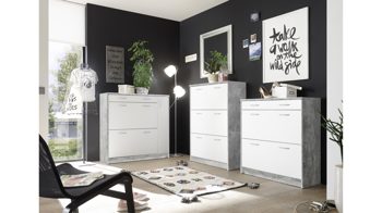 Der Schuhkipper Optimus ist enorm stilvoll designt und ausgesprochen praktisch. Mit der gelungenen Kombination aus herausragender Beton-Nachbildung und strahlend weißen Kunststoffoberflächen bringt der Schuhschrank moderne Eleganz in den Raum, in dem Sie ihn platzieren. Akzente setzen die alufarbenen Griffe - sie heben sich in gewisser Weise ab, verbinden sich auf der anderen Seite aber auch perfekt mit dem Betonton und dem Weiß des attraktiv gestalteten Korpus.