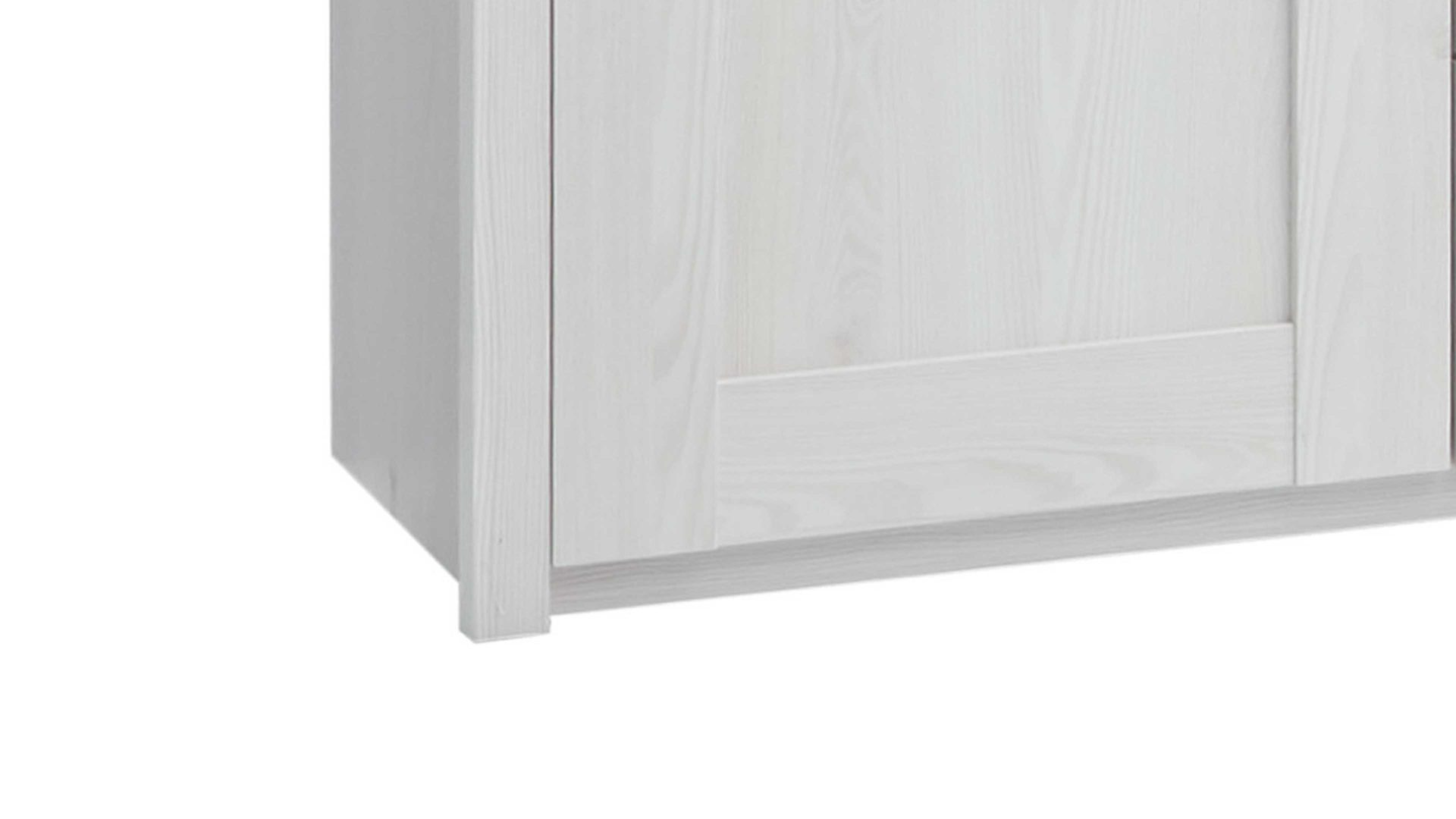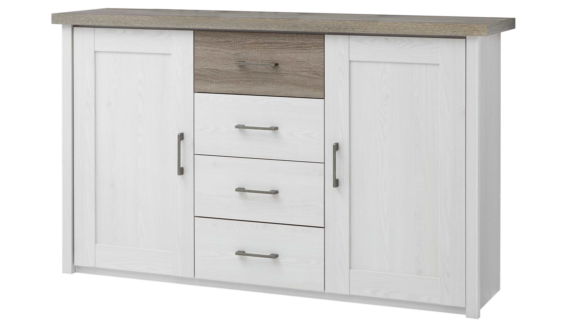Diese ansprechende Kombikommode wertet Ihr Schlafzimmer optisch wie funktional auf. Sie begeistert mit ihrem klassisch-eleganten Design, das Landhaus-Flair gepaart mit antikem Charme mit sich bringt. Zu weiten Teilen präsentiert sich der Schrank in weißer Pinien-Nachbildung. Akzentuierend wirken die trüffelfarbenen Details und die dunklen Griffe. Sie verleihen der prinzipiell hell gestalteten Kommode eine attraktive Tiefgründigkeit. Neben den visuellen Vorzügen bieten die erstklassig verarbeiteten Kunststoffoberflächen auch einen funktionalen Vorteil: Sie sind angenehm pflegeleicht.