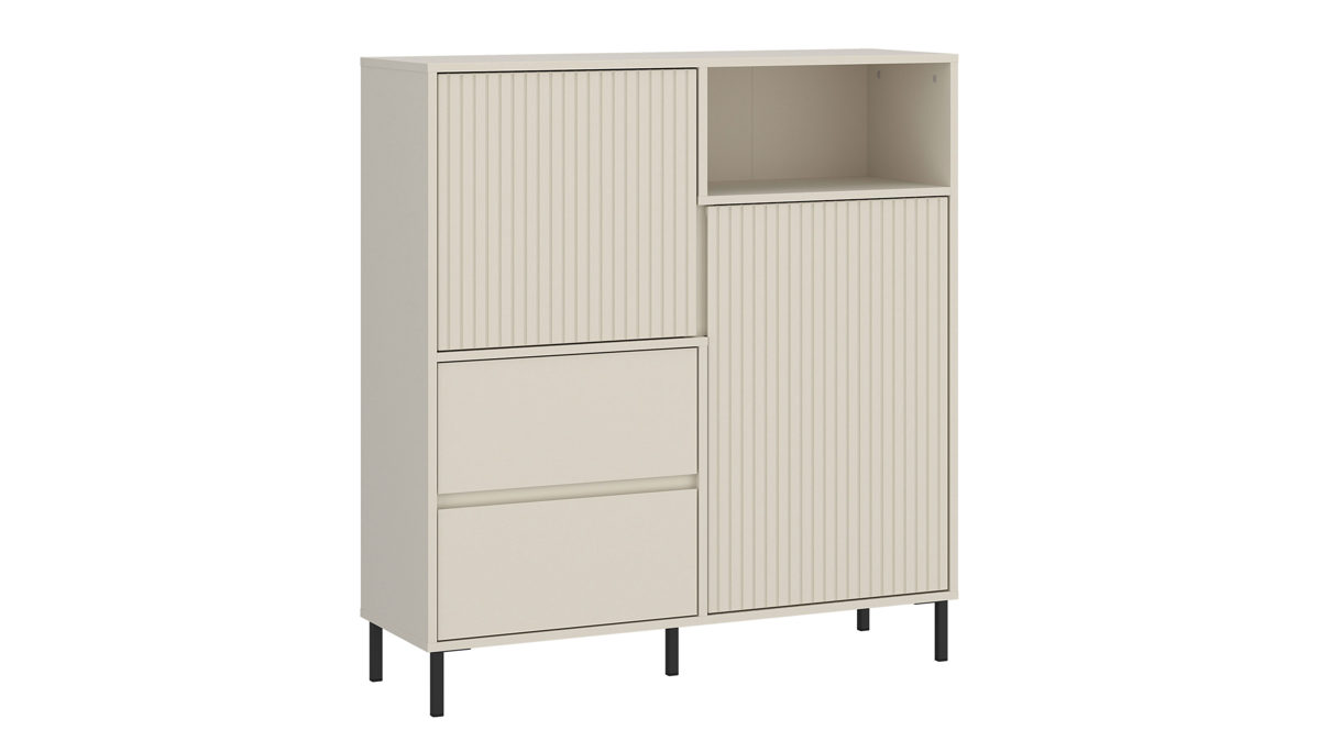 Cashmerefarbene Oberfläche, kombiniert mit schwarzen Metallfüßen