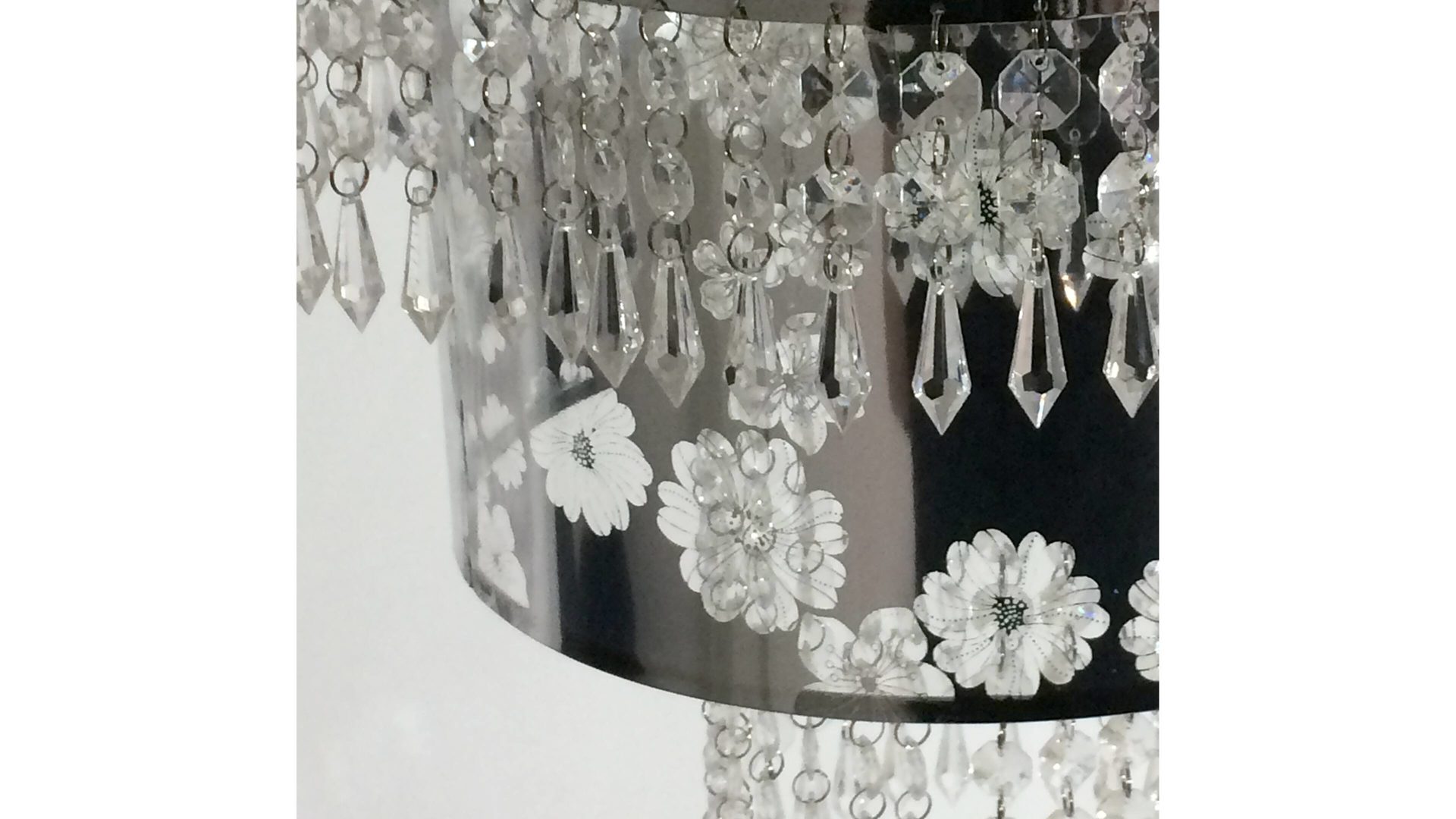 Sie offenbart einen chromfarbenen Metall-Lampenschirm mit floralem Muster und ein Gehänge aus Acrylglas, das zweifelsohne als optisches Highlight fungiert. Alles in allem präsentiert sich die Hängelampe außergewöhnlich komponiert. Durch die ausgeprägte Eleganz setzt sie in jedem Raum einen noblen Akzent.