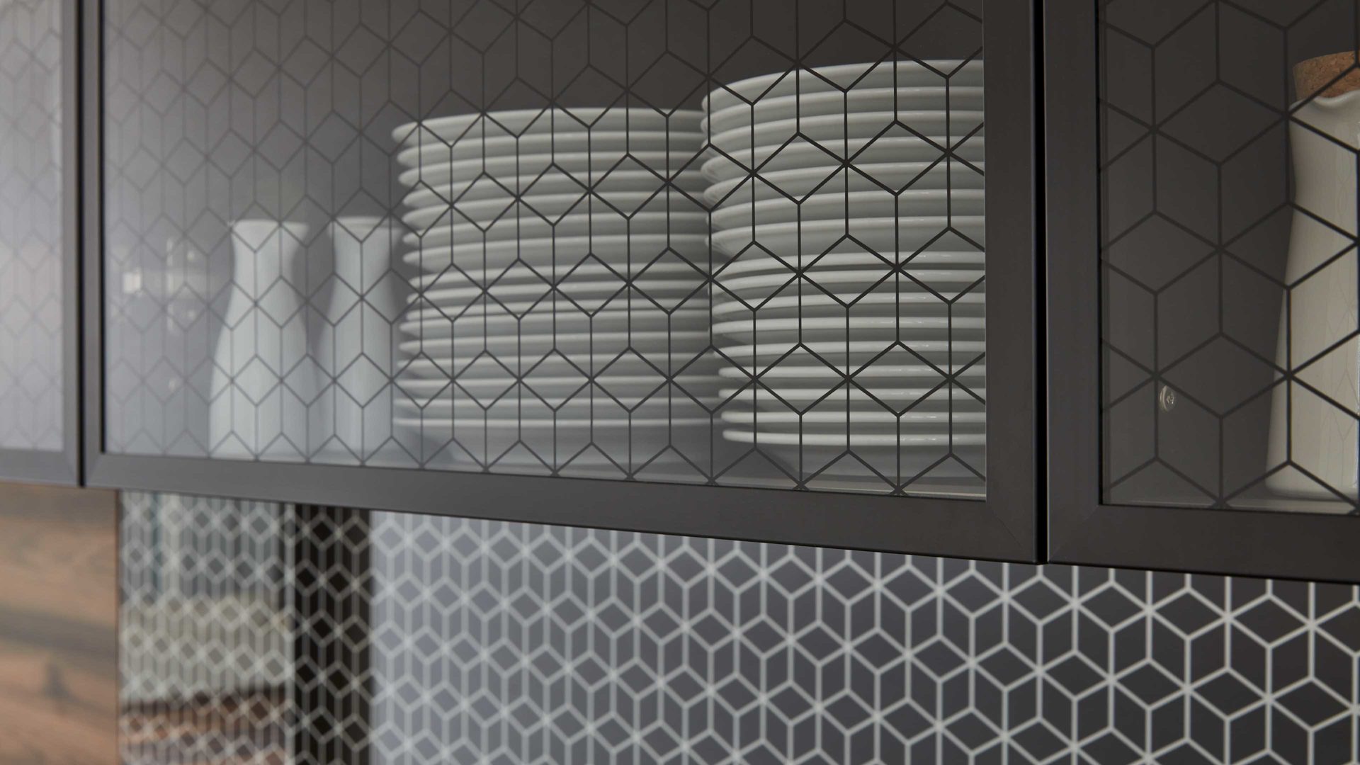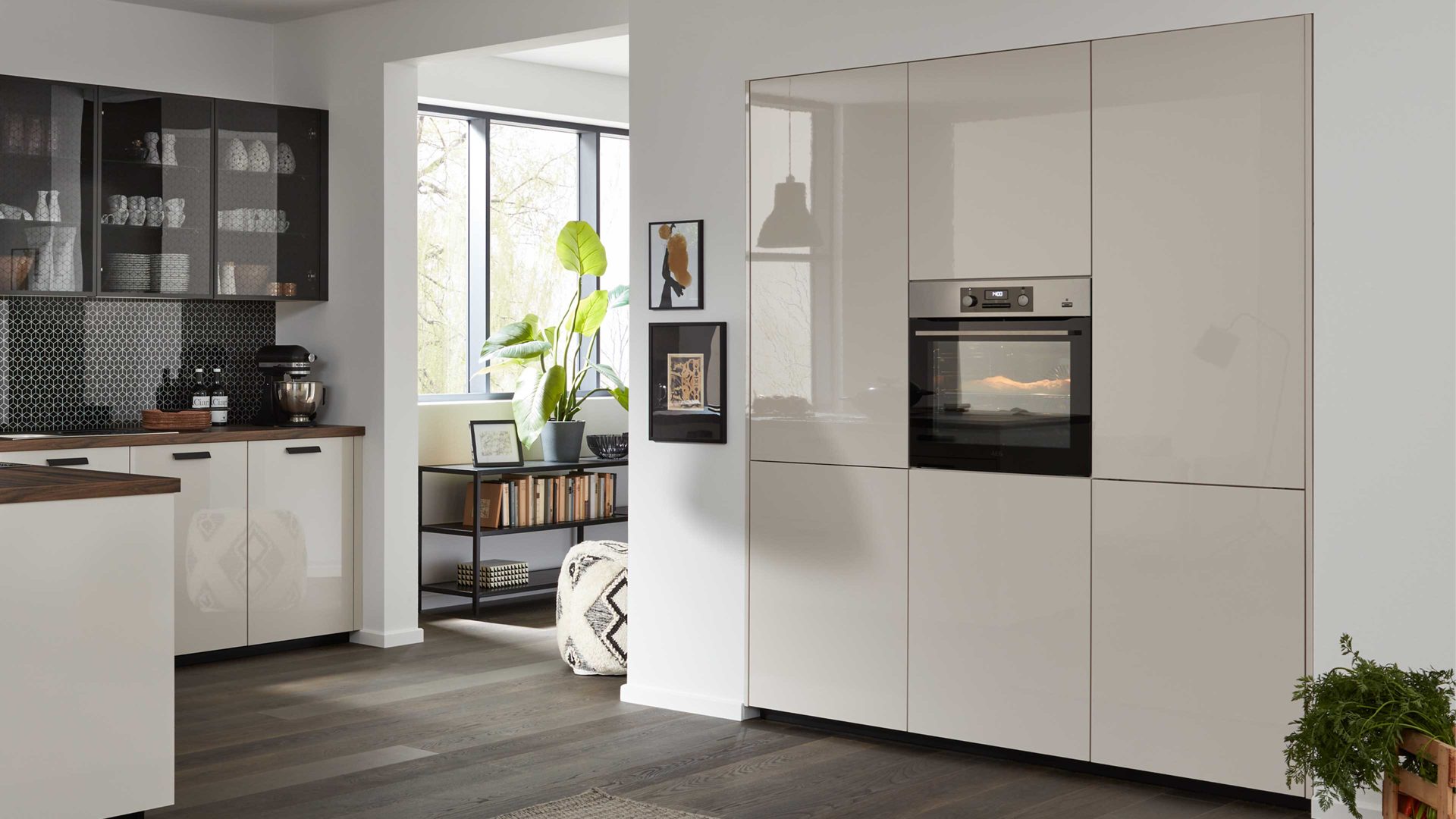 Die WERT KÜCHE® Ulrike kombiniert muschelweiße Hochglanzfronten mit Arbeitsplatten, Sockelleisten, einer Rückwandverkleidung und einem Regal in Nussbaum Tobacco-Nachbildung. Akzente setzen die Glasfronten sowie die gläserne Nischenverkleidung mit trendigem Rhombusmuster. Onyxschwarze Griffe und Glasrahmen runden das moderne Design harmonisch ab.