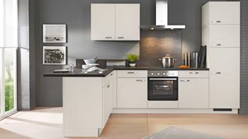 Stellfläche und Schenkelmaß der L-förmigen Küchenzeile belaufen sich auf ca. 335 x 185 cm (BxL, von links nach rechts). Sie beherbergt zahlreiche Schränke und Auszüge, in denen Sie jede Menge Lebensmittel, Geschirr und andere Küchenutensilien verstauen können. Ein echtes Highlight bildet der einladende Ansetztisch.