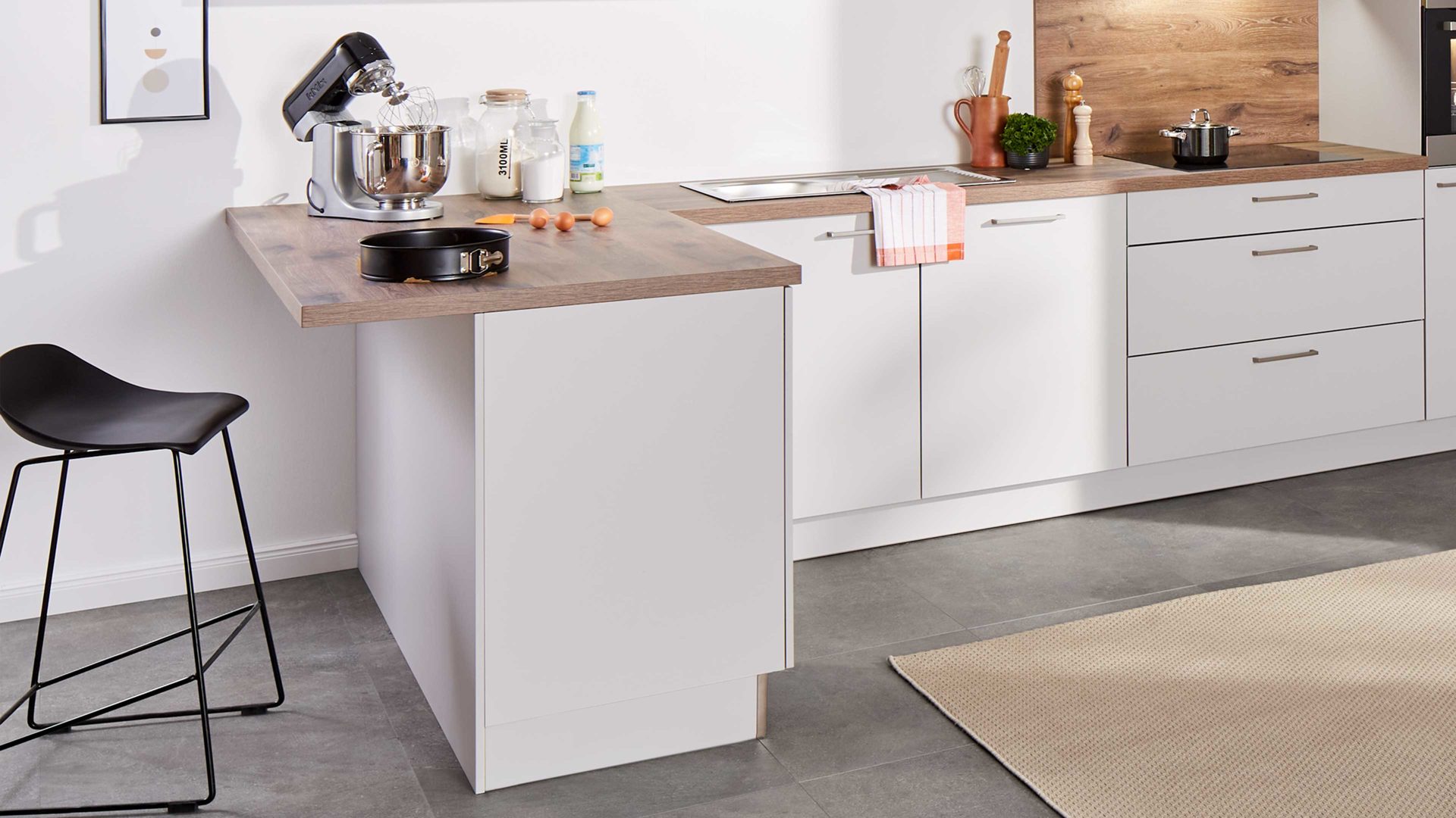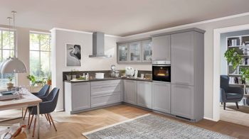 mattes Hellgrau, kombiniert mit brauner Eiche-Nachbildung und edelstahlfarbenen Metallgriffen