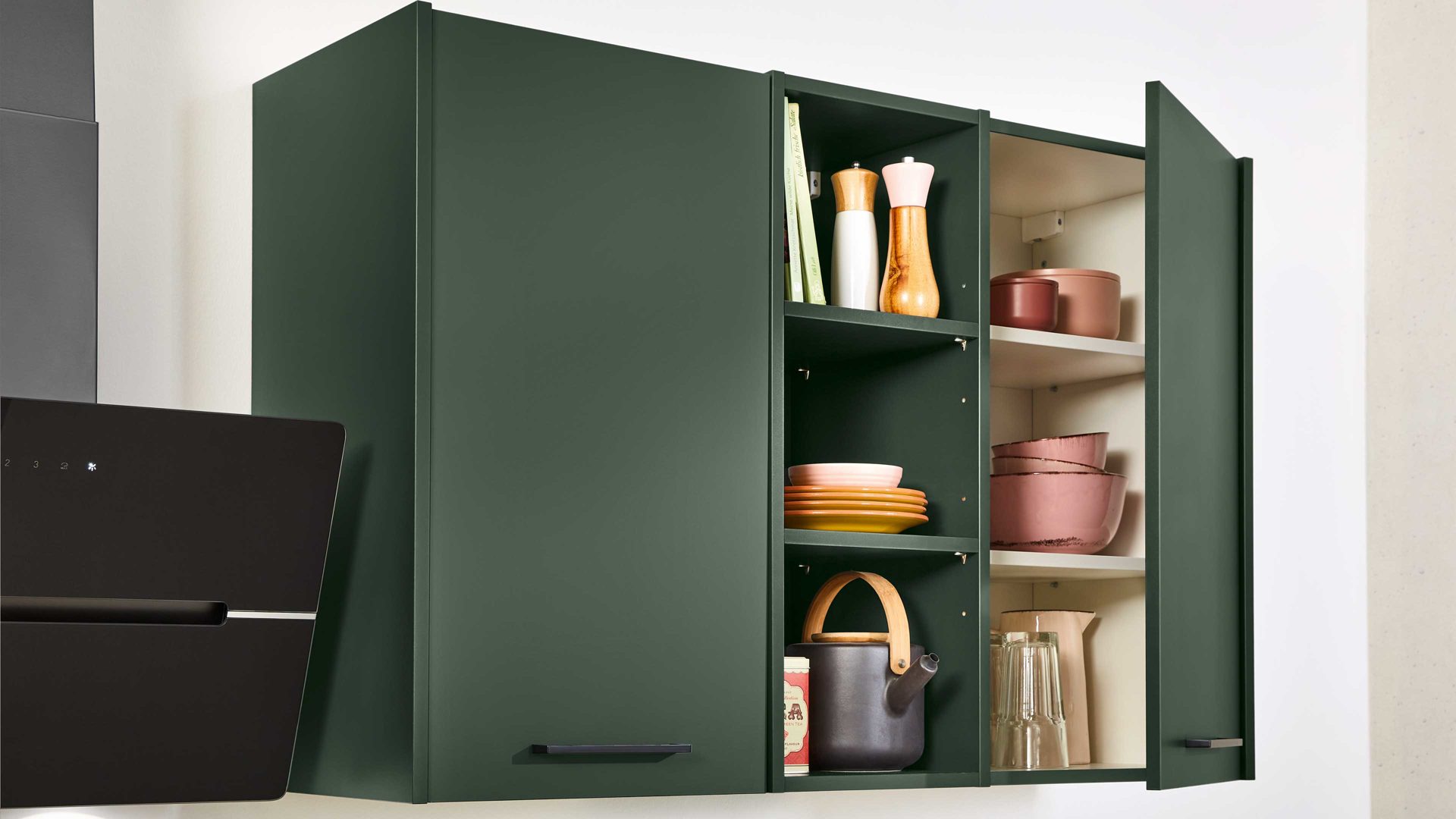 mattes Dunkelgrün, zementfarbene Arbeitsplatten und schwarze Sockelblenden