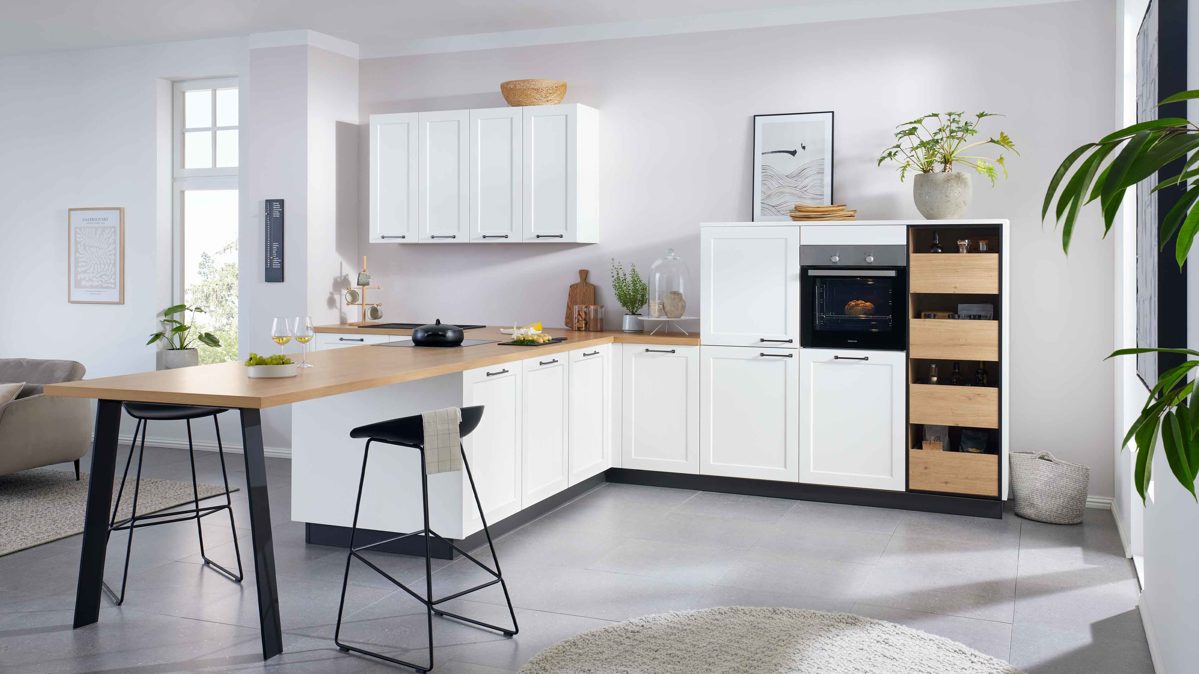 Die WERT KÜCHE® Vida verbindet den charmanten Charakter einer Landhausküche mit einer klaren, modernen Gestaltung. Satinweiße Fronten treffen auf warme Elemente in naturfarbener Asteiche-Nachbildung, während lavaschwarze Sockelblenden und Schwarzstahl-Bügelgriffe stilvolle Kontraste setzen. So entsteht eine Küche, die Gemütlichkeit und zeitgemäßes Design perfekt miteinander vereint.