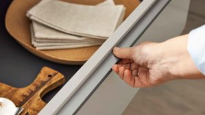 mattes Kieselgrau, kombiniert mit dunkler Eiche-Nachbildung in Rillenoptik und edelstalfarbenen Griffleisten