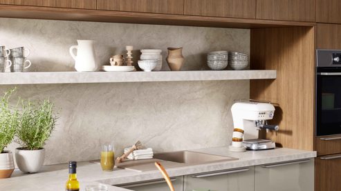 Arbeitsplatten und Nischenverkleidung in beiger Sandstein-Nachbildung
