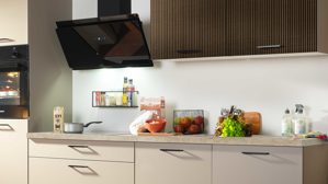 hochgebauter Backofen, vollintegrierter Kühlschrank und eine kopffreie Dunsthaube