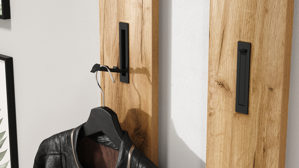 Melaminharzoberfläche in Navarra Eiche Nachbildung mit schwarz pulverbeschichteten Metallhaken