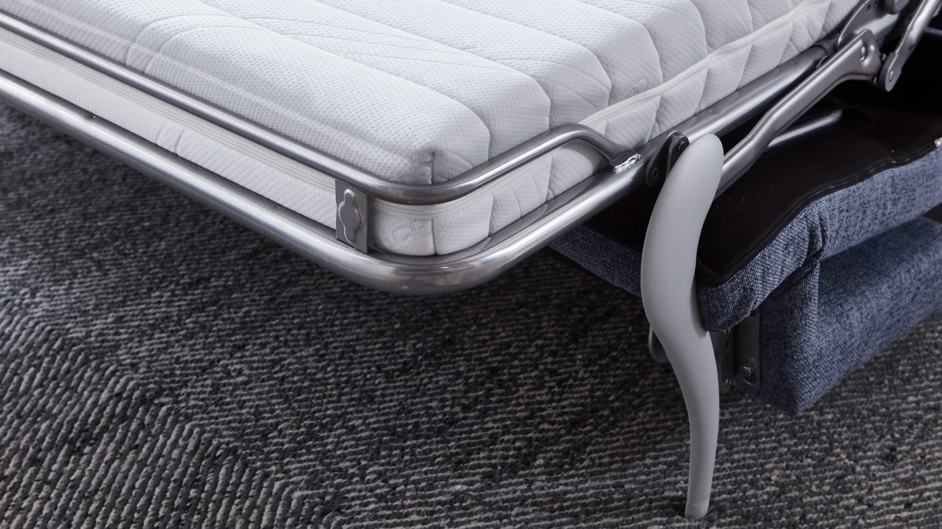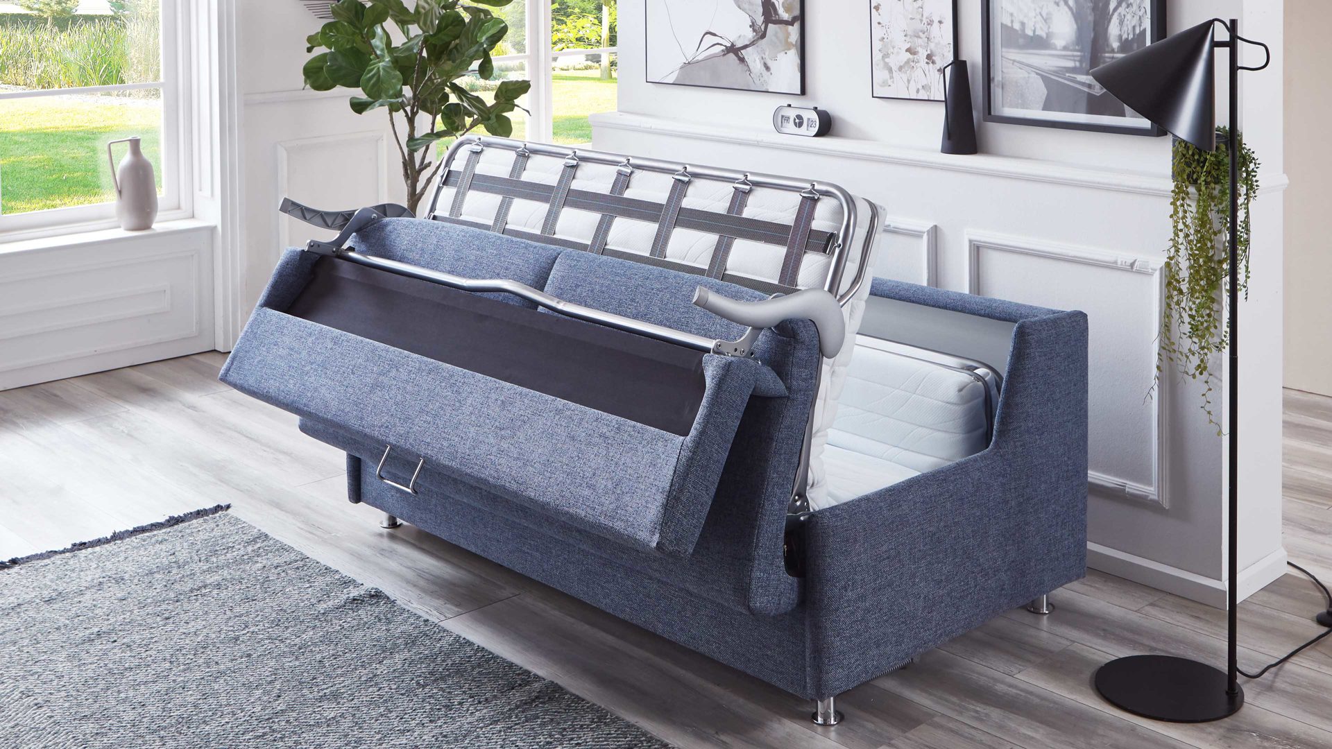 Das Schlafsofa Grande ist die perfekte Lösung für alle, die auf der Suche nach einem stilvollen und funktionalen Möbelstück sind. Mit seinem graublauen Stoffbezug und den chromfarbenen Metallzylinderfüßen ist es nicht nur ein Blickfang in jedem Raum, sondern auch äußerst bequem.