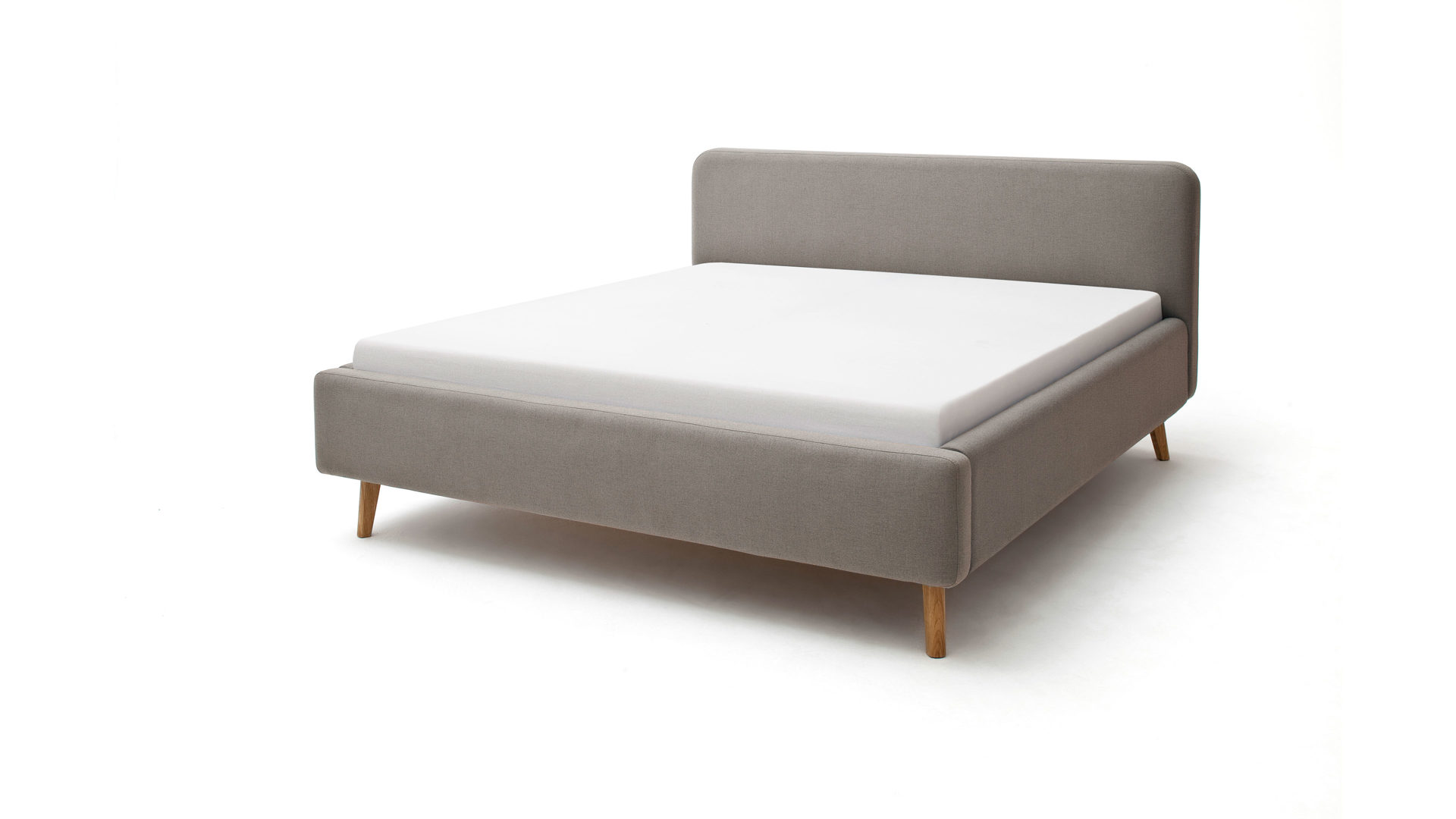 Das Polsterbettgestell Mattis begeistert durch die elegante Optik sowie die hervorragende Material- und Verarbeitungsqualität. Es kombiniert einen taupefarbenen Flachgewebe-Bezug mit eichefarbenen Holzfüßen. Sowohl die Bettseiten als auch das Polsterkopfteil sind glatt bezogen. Letzteres lädt Sie ein, sich anzulehnen, wenn Sie abends im Bett vor dem Schlafen noch fernsehen oder in einem Buch lesen.