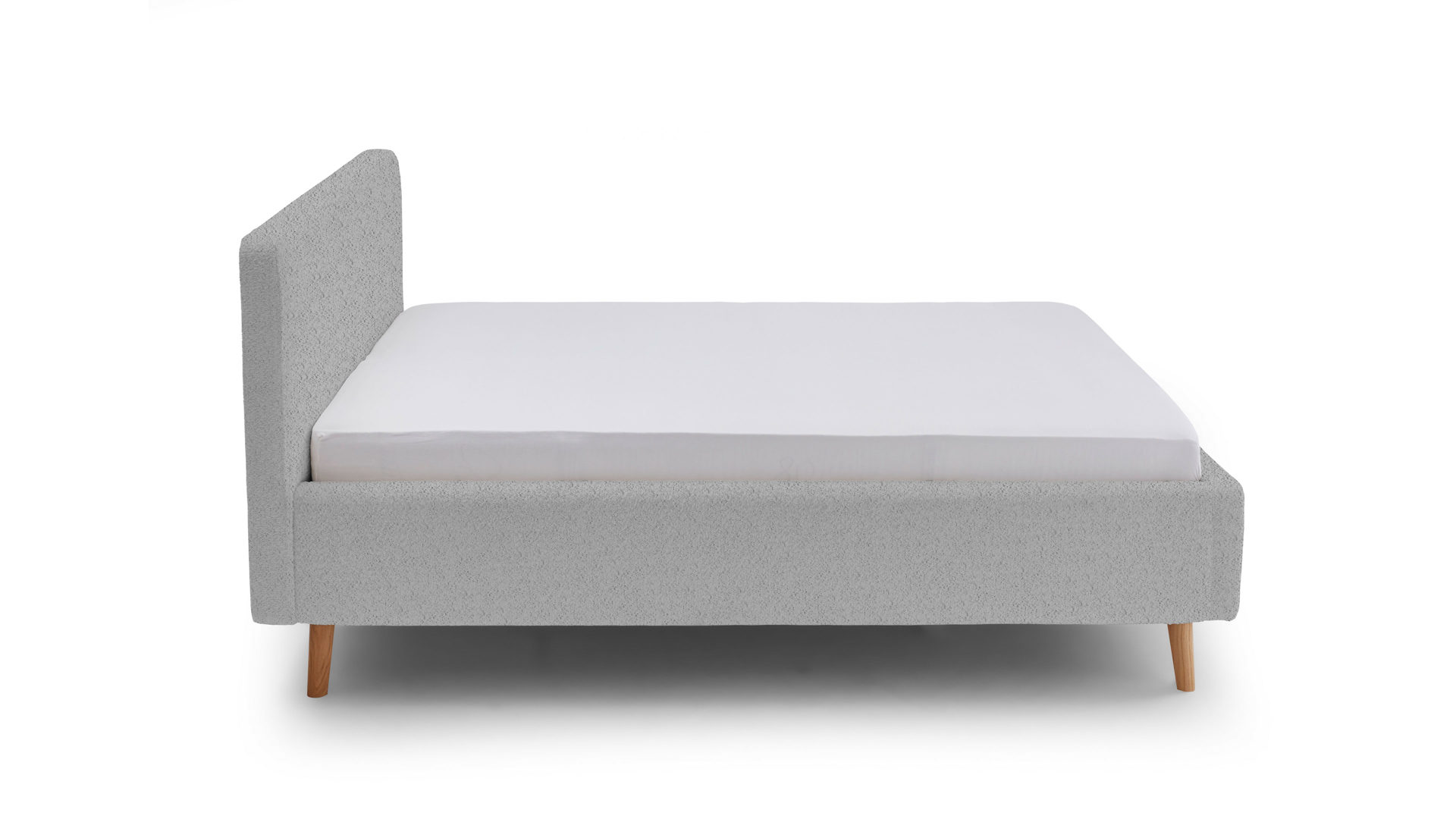 Das Polsterbettgestell Mattis begeistert durch die elegante Optik sowie die hervorragende Material- und Verarbeitungsqualität. Es kombiniert einen grauen Boucle-Bezug mit eichefarbenen Holzfüßen. Sowohl die Bettseiten als auch das Polsterkopfteil sind glatt bezogen. Letzteres lädt Sie ein, sich anzulehnen, wenn Sie abends im Bett vor dem Schlafen noch fernsehen oder in einem Buch lesen.