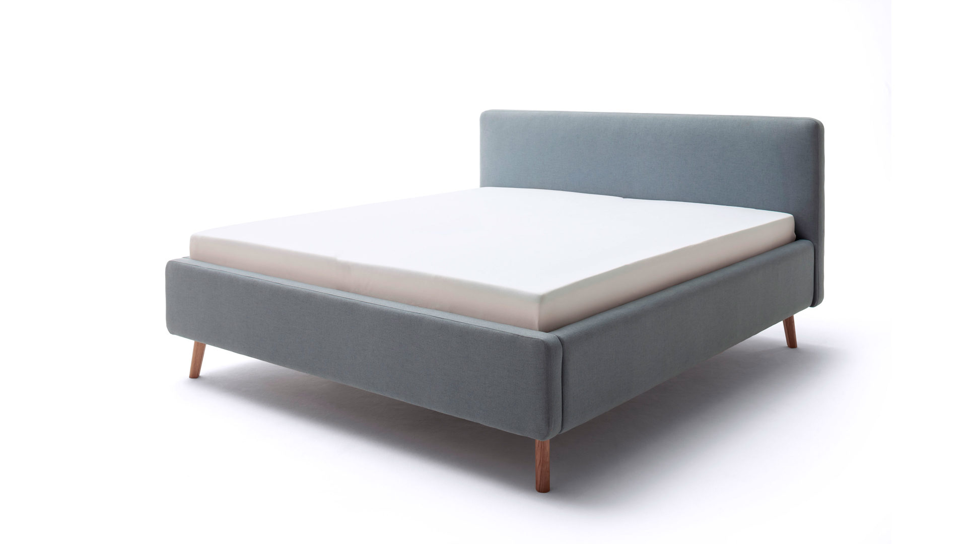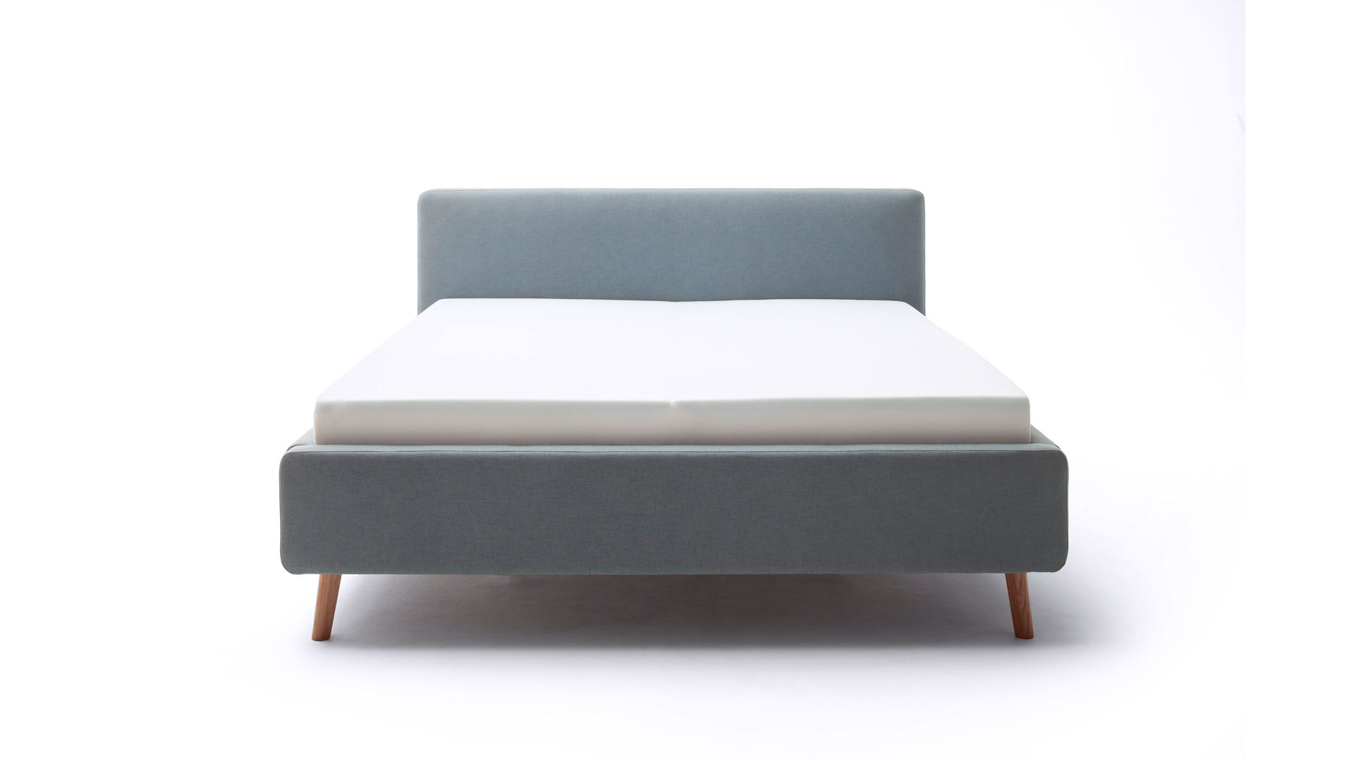 Das Polsterbettgestell Mattis begeistert durch die elegante Optik sowie die hervorragende Material- und Verarbeitungsqualität. Es kombiniert einen eisblauen Flachgewebe-Bezug mit eichefarbenen Holzfüßen. Sowohl die Bettseiten als auch das Polsterkopfteil sind glatt bezogen. Letzteres lädt Sie ein, sich anzulehnen, wenn Sie abends im Bett vor dem Schlafen noch fernsehen oder in einem Buch lesen.
