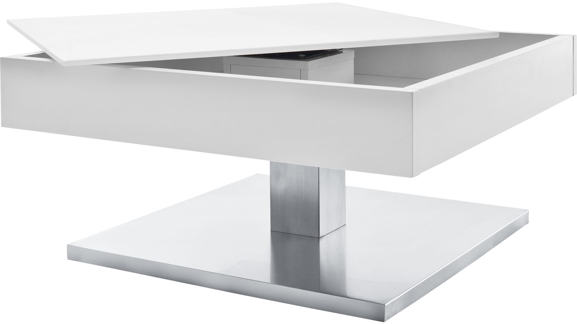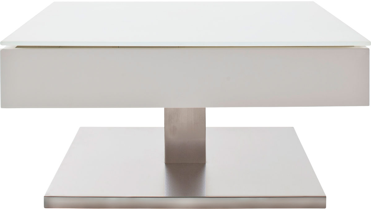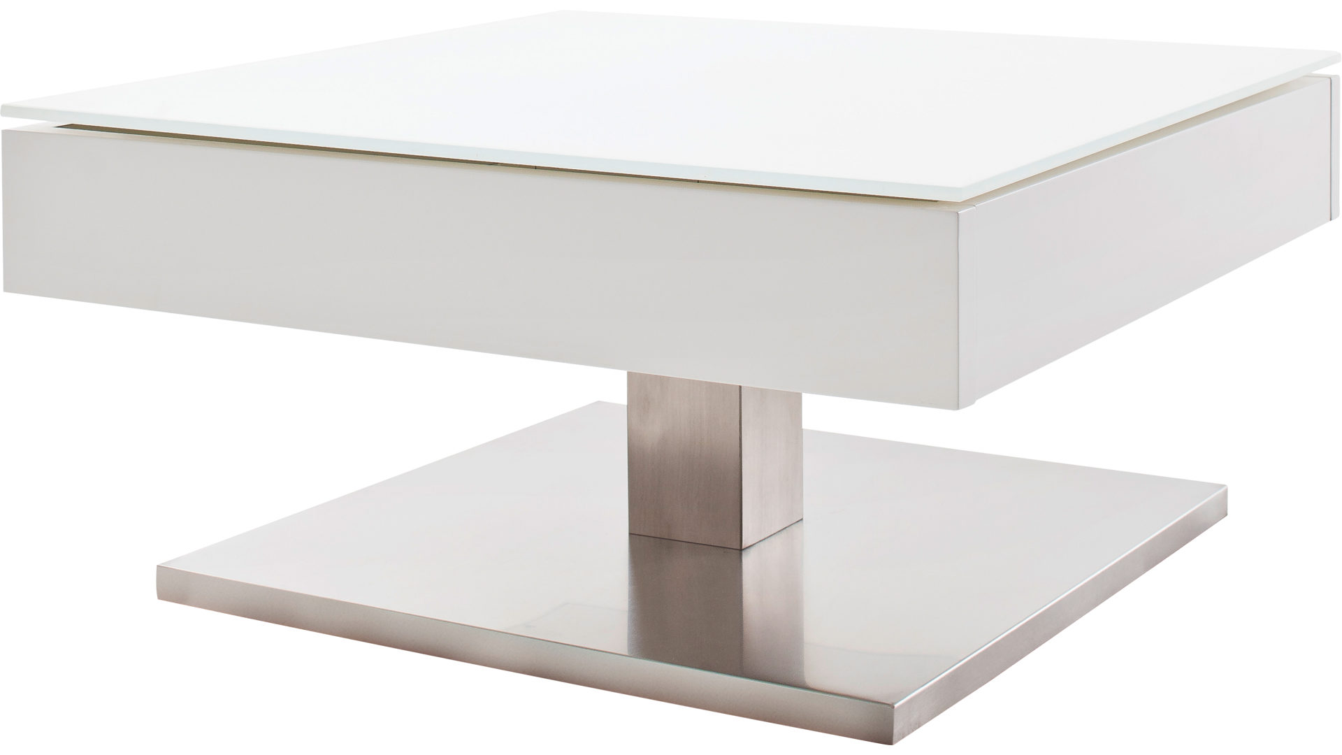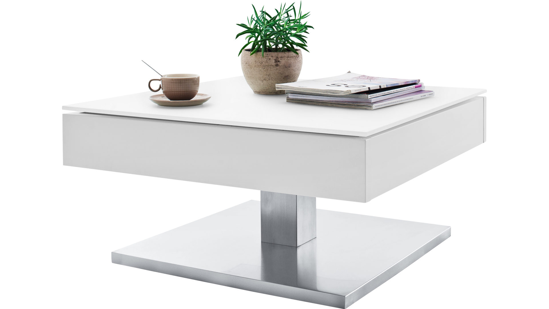 Der Couchtisch Mariko beeindruckt mit seinem außergewöhnlichen Design, das besonders extravagant erscheint und in jedem Wohnzimmer zu einem absoluten Eyecatcher wird. Als robuste Basis fungiert ein klassisch-edelstahlfarbener und gebürsteter Sockel auf einem drehbaren mattweißen Glasboden, den Sie bis maximal 20 kg belasten können. Die mattweiß lackierte Tischplatte rundet die spannende Optik des Couchtisches schlicht und harmonisch ab.
