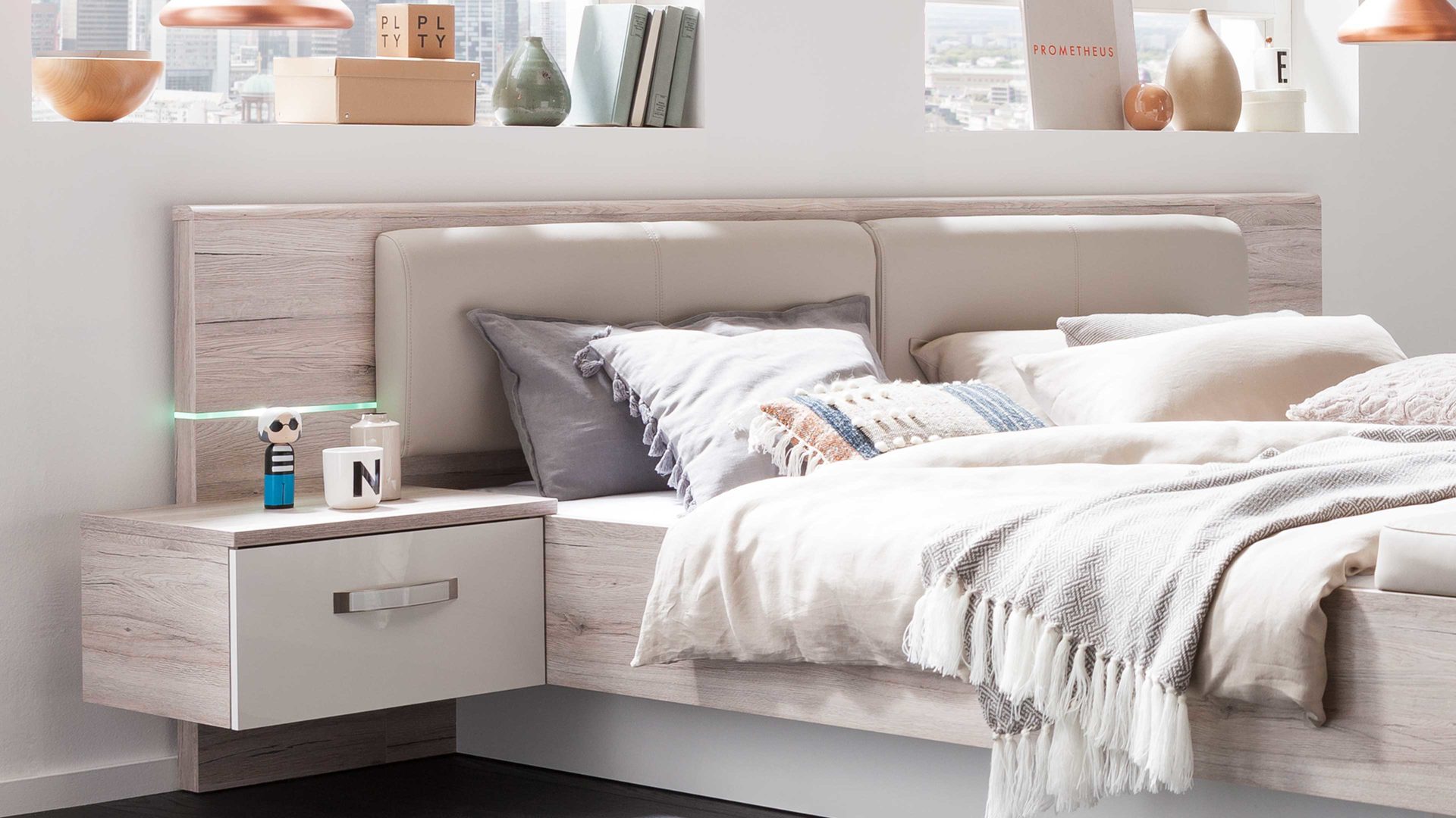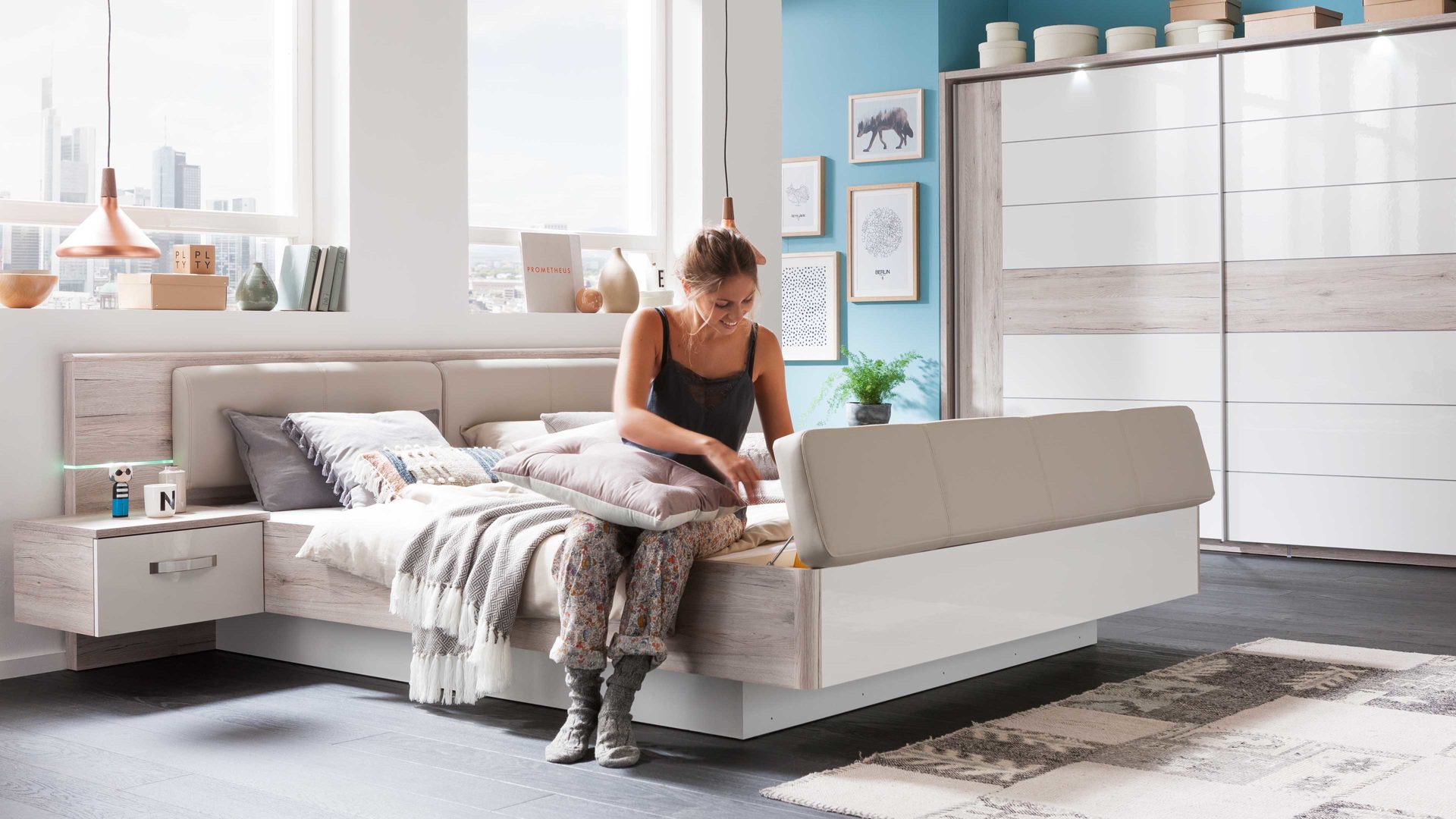 Das Doppelbettgestell ist in Sandeiche-Nachbildung gehalten, kombiniert mit strahlend weißen Hochglanzoberflächen. Durch die helle Farbverbindung sorgt das hochwertige Doppelbett für ein warmes, einladendes Ambiente in Ihrem Schlafzimmer. Zudem verkörpert die Bettanlage Eleganz vom Feinsten. Einen stilvollen Akzent setzt die edle Maserung der Sandeiche-Nachbildung. Mit der Glasbodenbeleuchtung im Kopfteil bietet das Bett noch einen optischen Höhepunkt.