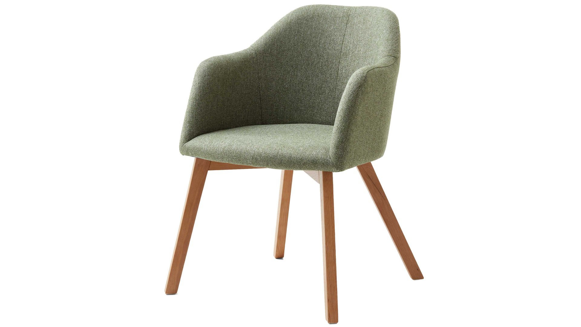 Darüber hinaus weiß er in puncto Komfort zu überzeugen. Lackierte Eichenholzfüße bilden die robuste Basis. Das natürliche Material sorgt einerseits für die nötige Stabilität und bringt andererseits ein warmes, einladendes Flair in den Raum. Attraktiv abgerundet wird der Vierfußstuhl durch den blassgrünen Webstoffbezug. Die außergewöhnliche Farbe wirkt überaus elegant und harmoniert vorzüglich mit den Holzfüßen. Einen feinen Akzent setzt die Steppnaht im Rücken des Schalensitzes.