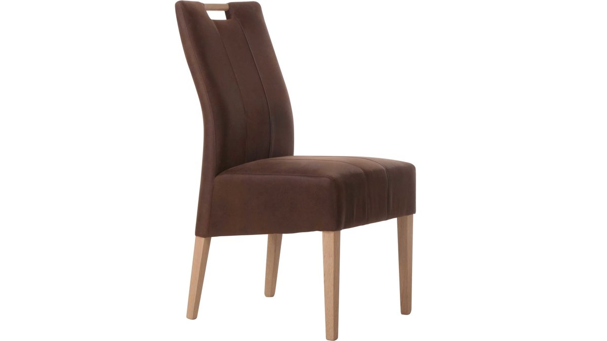 Warm und einladend wirkt der hochwertige Polsterstuhl Vigo mit dunkelbraunem Bezug. Die vier Eichenholzfüße sind Natur lackiert und unterstreichen den schlichten Look des Sitzmöbels genauso wie die Rückenlehne mit Holzgriff. Aufwendige Ziernähte verleihen dem interessanten Design des Polsterstuhls einen zusätzlichen Schliff. Mit den praktischen Maßen von ca. 48 x 96 x 59 cm (BxHxT) findet der Vierfußstuhl auch an kleineren Tischen Platz.