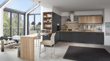 Die geschmackvolle WERT KÜCHE® Nova im modernen Farbmix besticht durch ihren edlen lavaschwarzen Korpus und die freundlichen Arbeitsplatten in einer Alteiche Provence-Nachbildung.