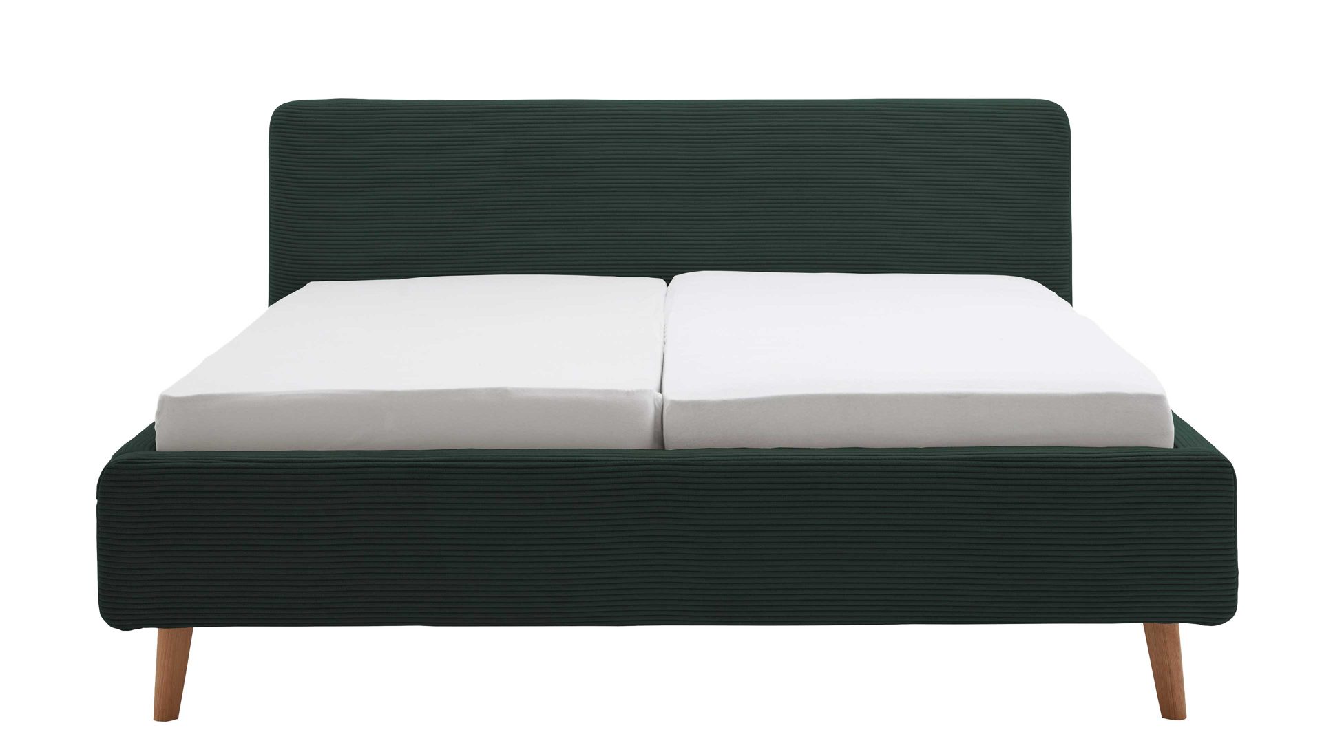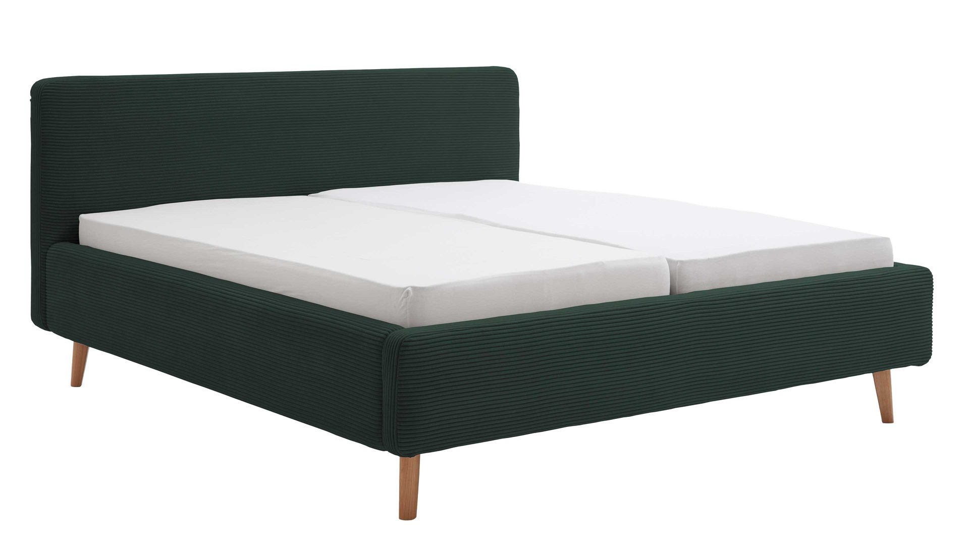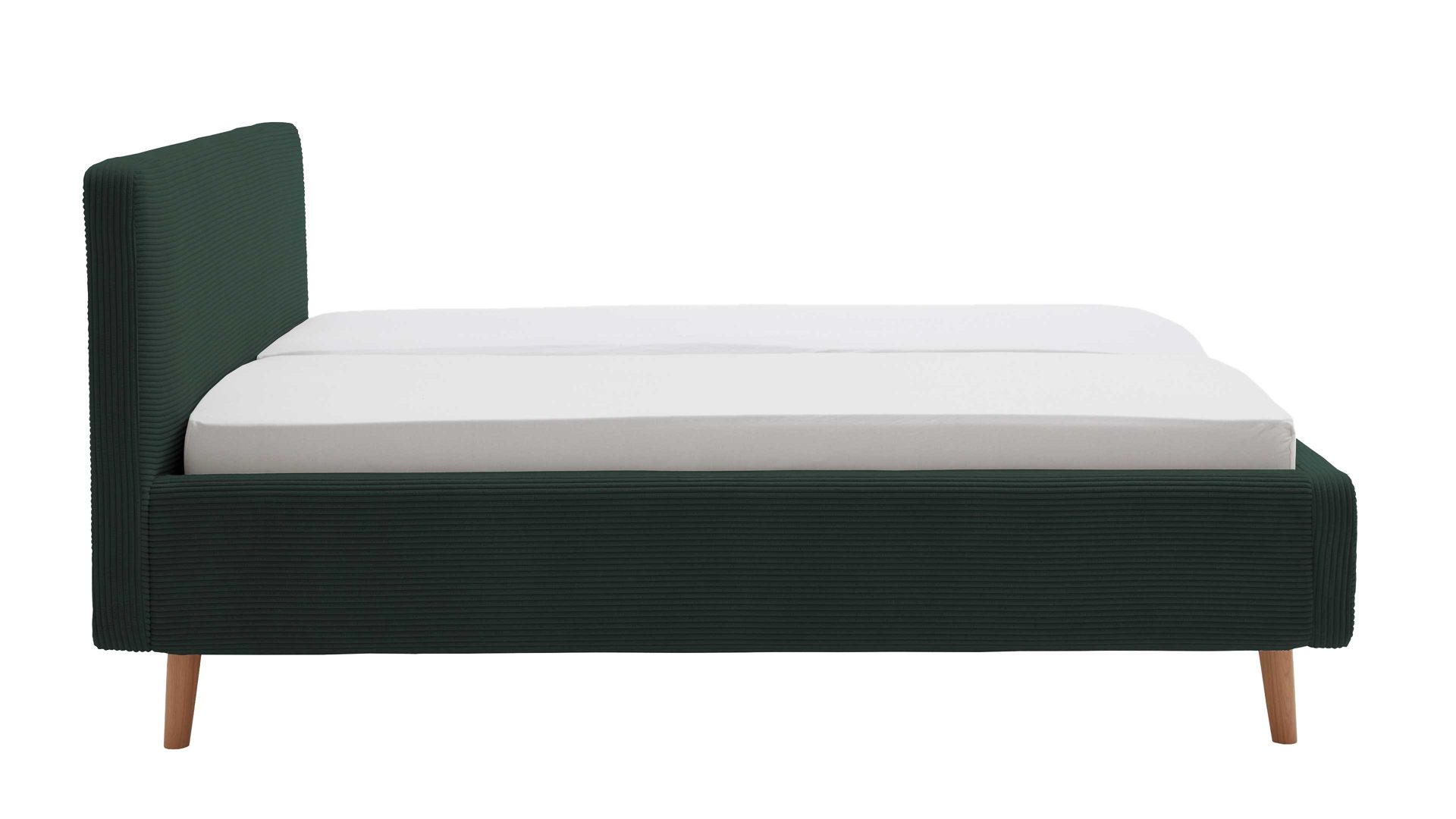 Das Polsterbettgestell Mattis mit Bettkasten begeistert durch die elegante Trendoptik sowie die exzellente Material- und Verarbeitungsqualität. Es kombiniert eichefarbene Holzfüße mit einem dunkelgrünen Breitcordbezug. Sowohl die Bettseiten als auch das Polsterkopfteil sind glatt bezogen. Letzteres lädt Sie ein, sich anzulehnen, wenn Sie abends im Bett vor dem Schlafen noch fernsehen oder in einem Buch lesen.