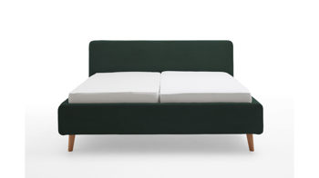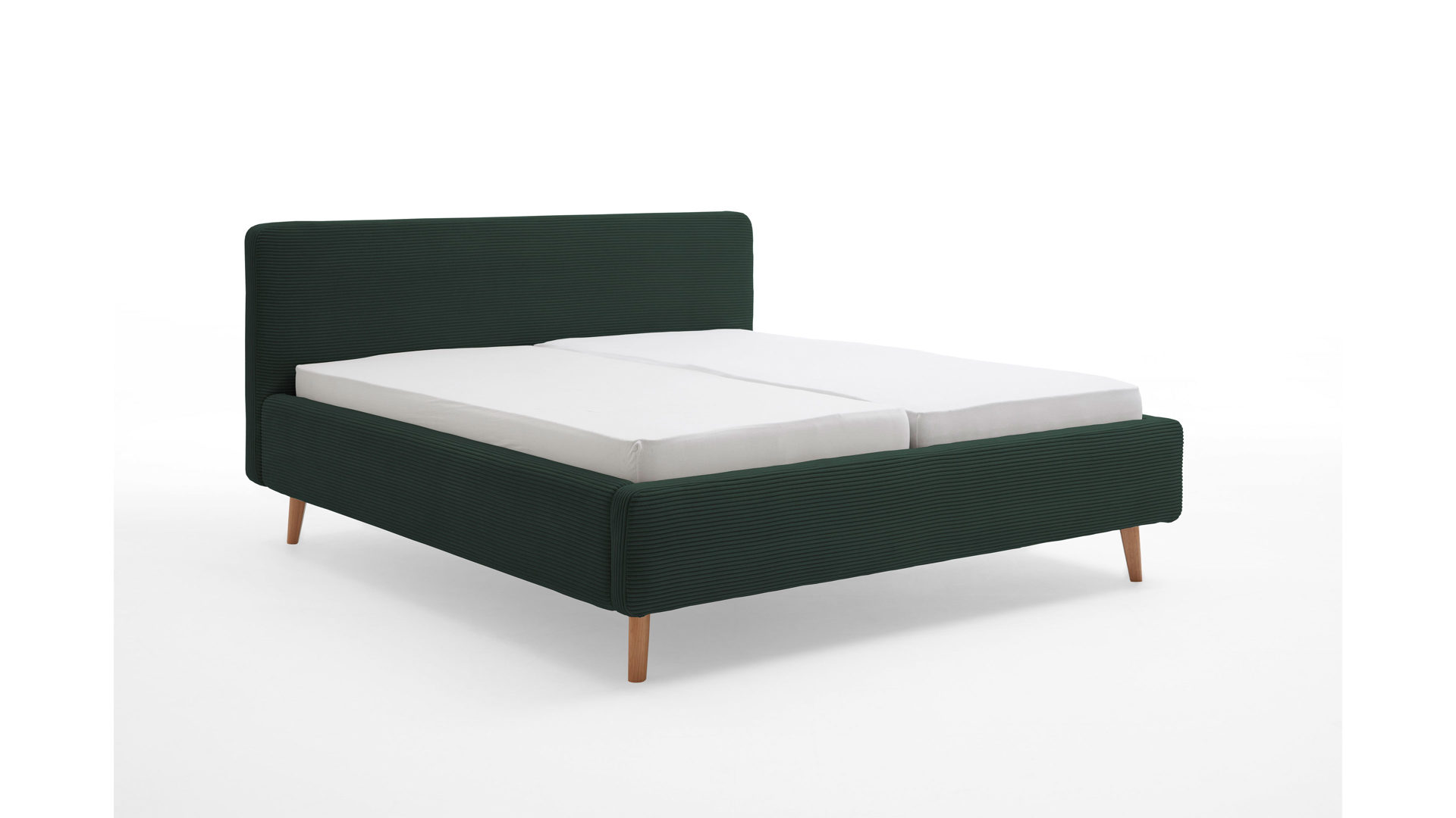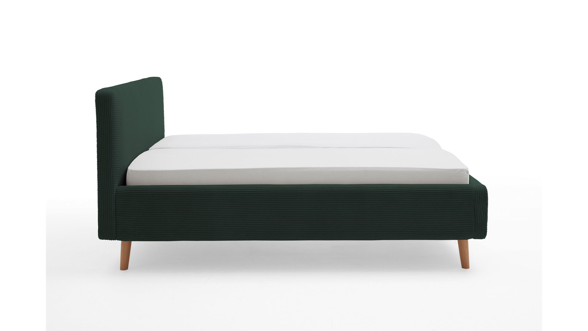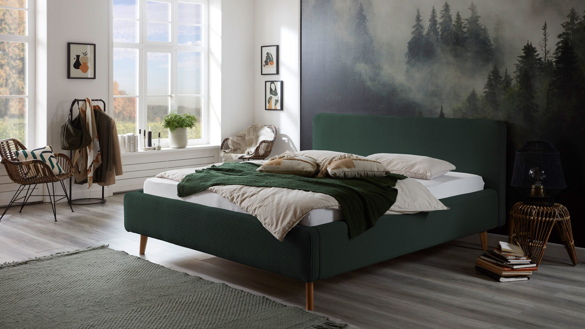 Das Polsterbettgestell Mattis begeistert durch die elegante Optik sowie die hervorragende Material- und Verarbeitungsqualität. Es kombiniert einen dunkelgrünen Breitcord-Bezug mit eichefarbenen Holzfüßen . Sowohl die Bettseiten als auch das Polsterkopfteil sind glatt bezogen. Letzteres lädt Sie ein, sich anzulehnen, wenn Sie abends im Bett vor dem Schlafen noch fernsehen oder in einem Buch lesen.