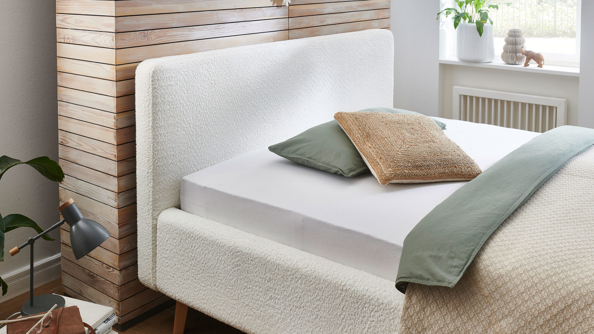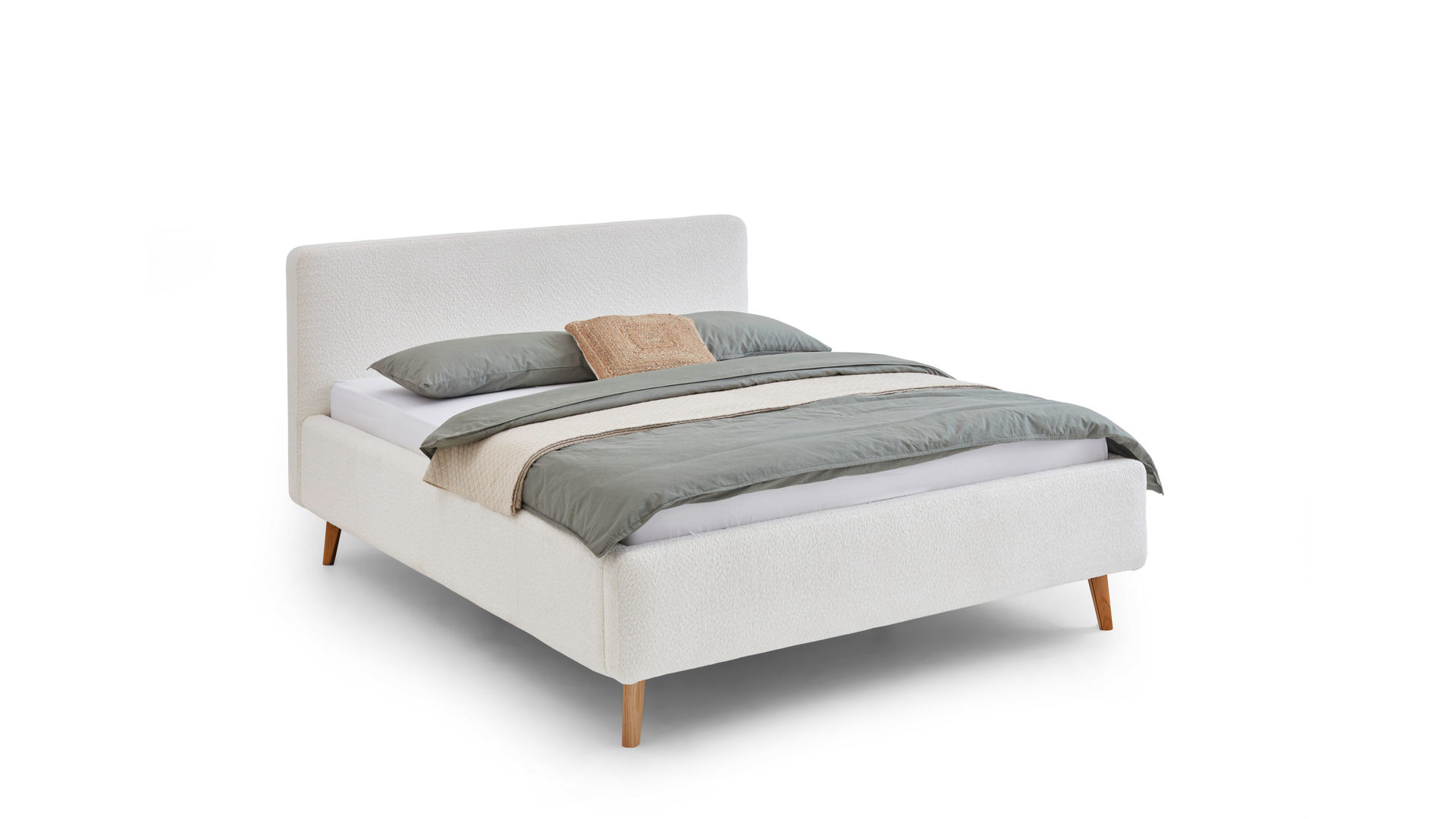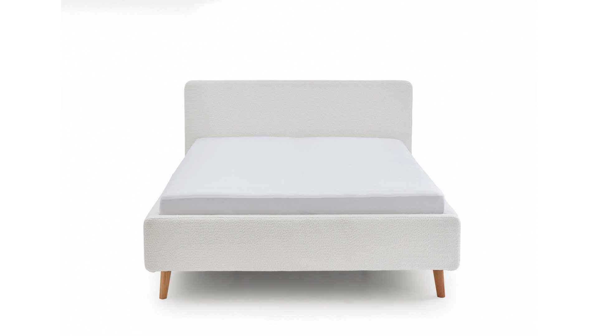 Das Polsterbettgestell Mattis begeistert durch die elegante Optik sowie die hervorragende Material- und Verarbeitungsqualität. Es kombiniert einen weißen Boucle-Bezug mit eichefarbenen Holzfüßen. Sowohl die Bettseiten als auch das Polsterkopfteil sind glatt bezogen. Letzteres lädt Sie ein, sich anzulehnen, wenn Sie abends im Bett vor dem Schlafen noch fernsehen oder in einem Buch lesen.